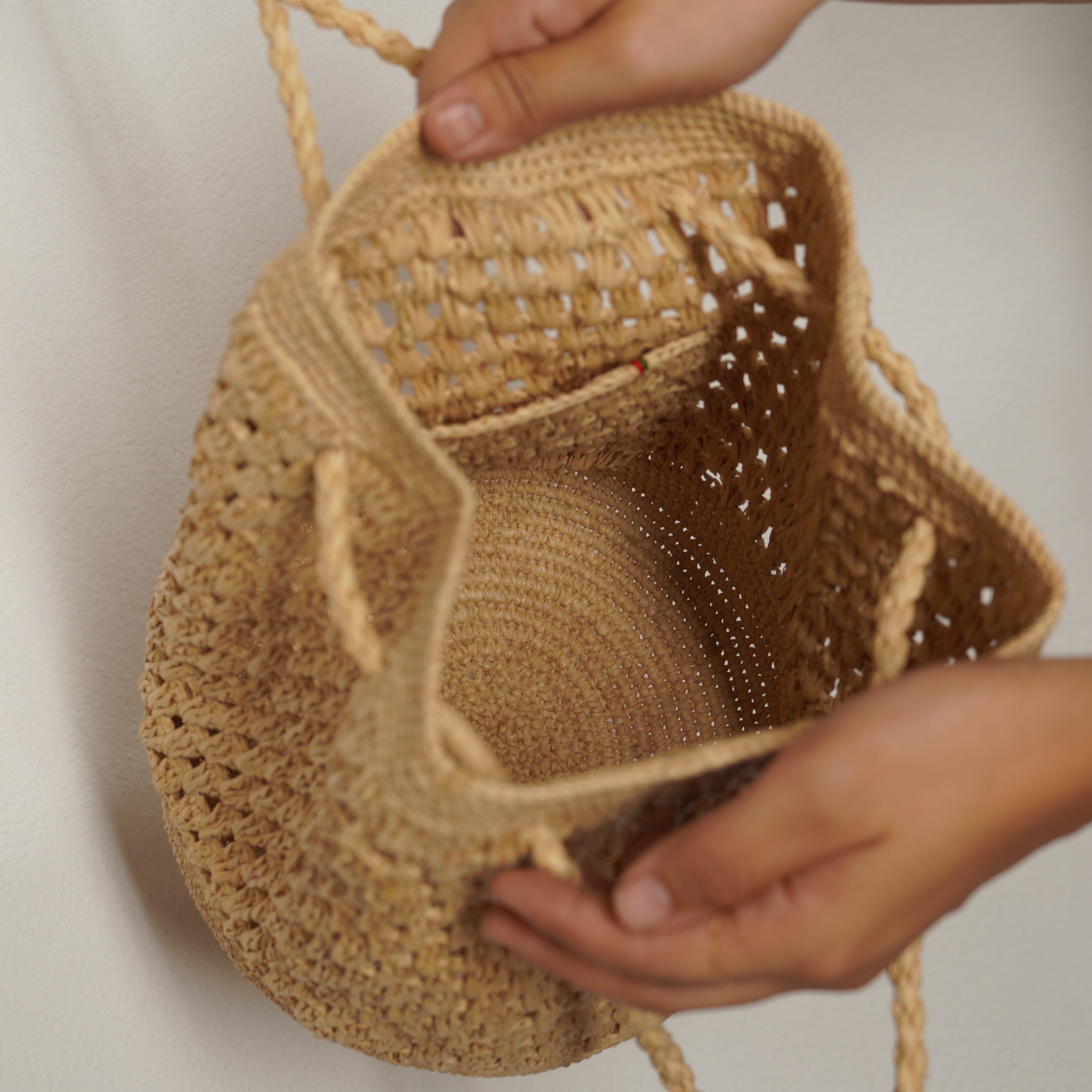 Inspired by the traditional drawstring pouch, we’ve created a compact bag that can be worn as a shoulder bag, a crossbody, or carried by hand. The top and bottom feature a dense, sturdy weave for durability, while the middle showcases a delicate open-weave that offers a hint of transparency without revealing too much. With its exceptional ease of use, this model is already destined to become an AMPIANA classic.