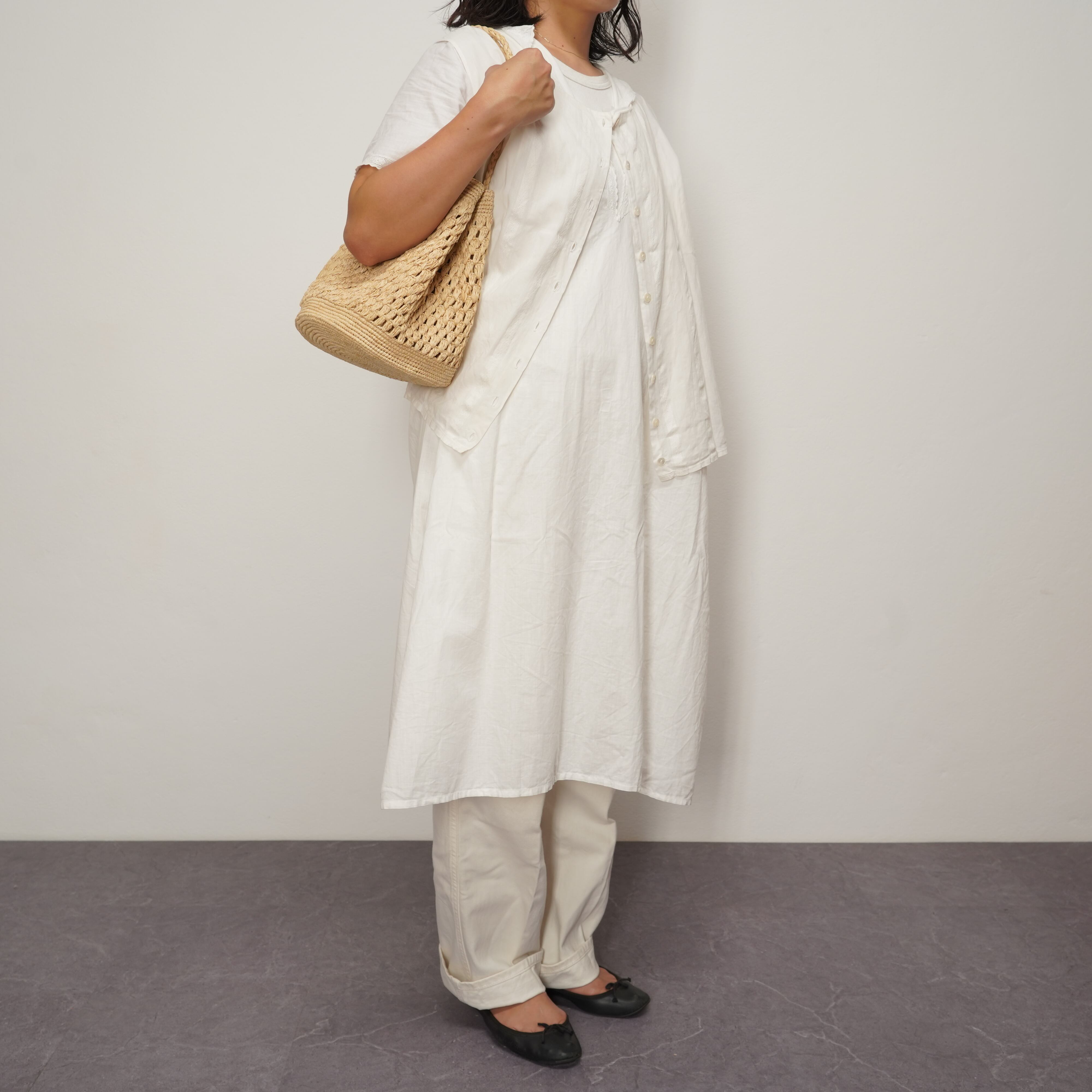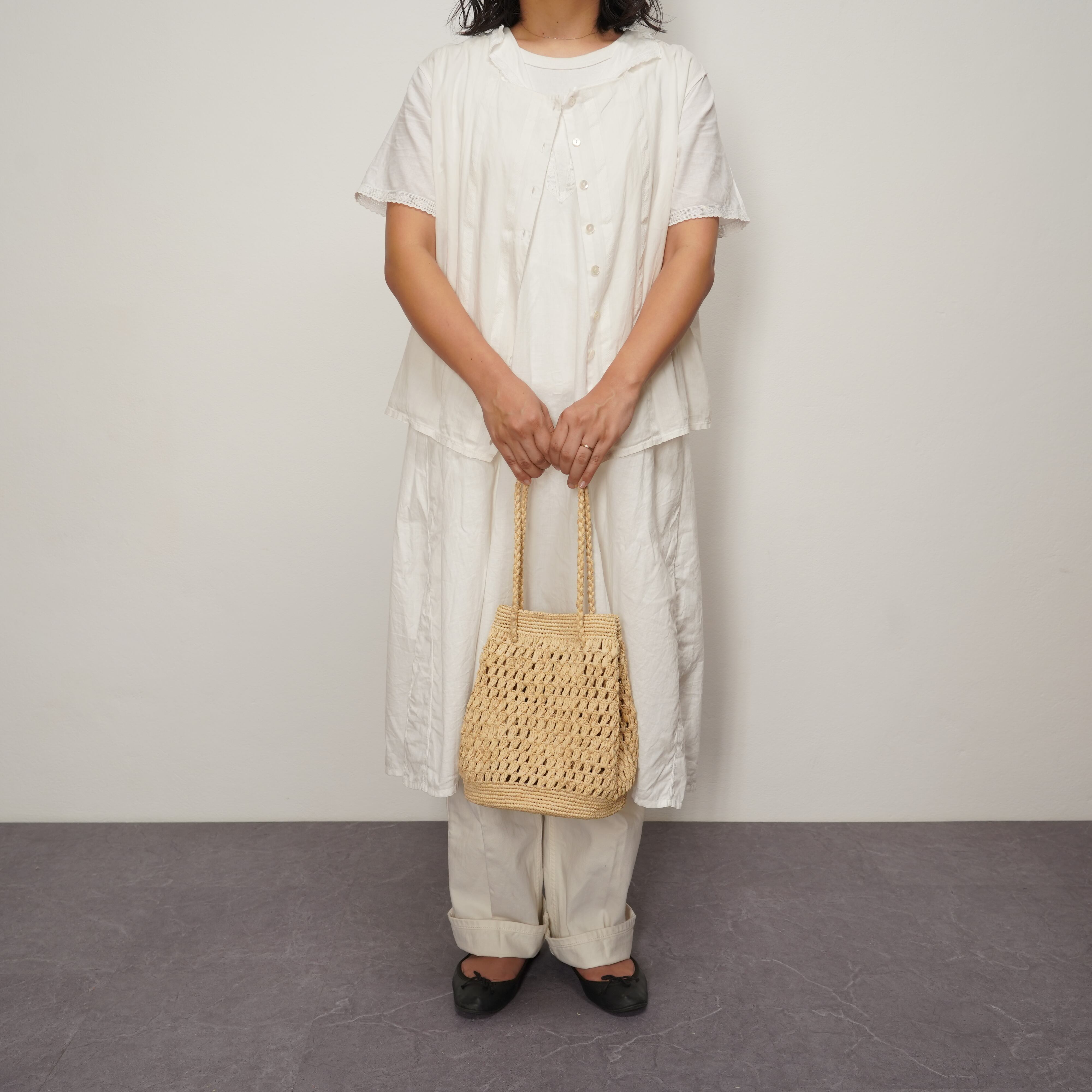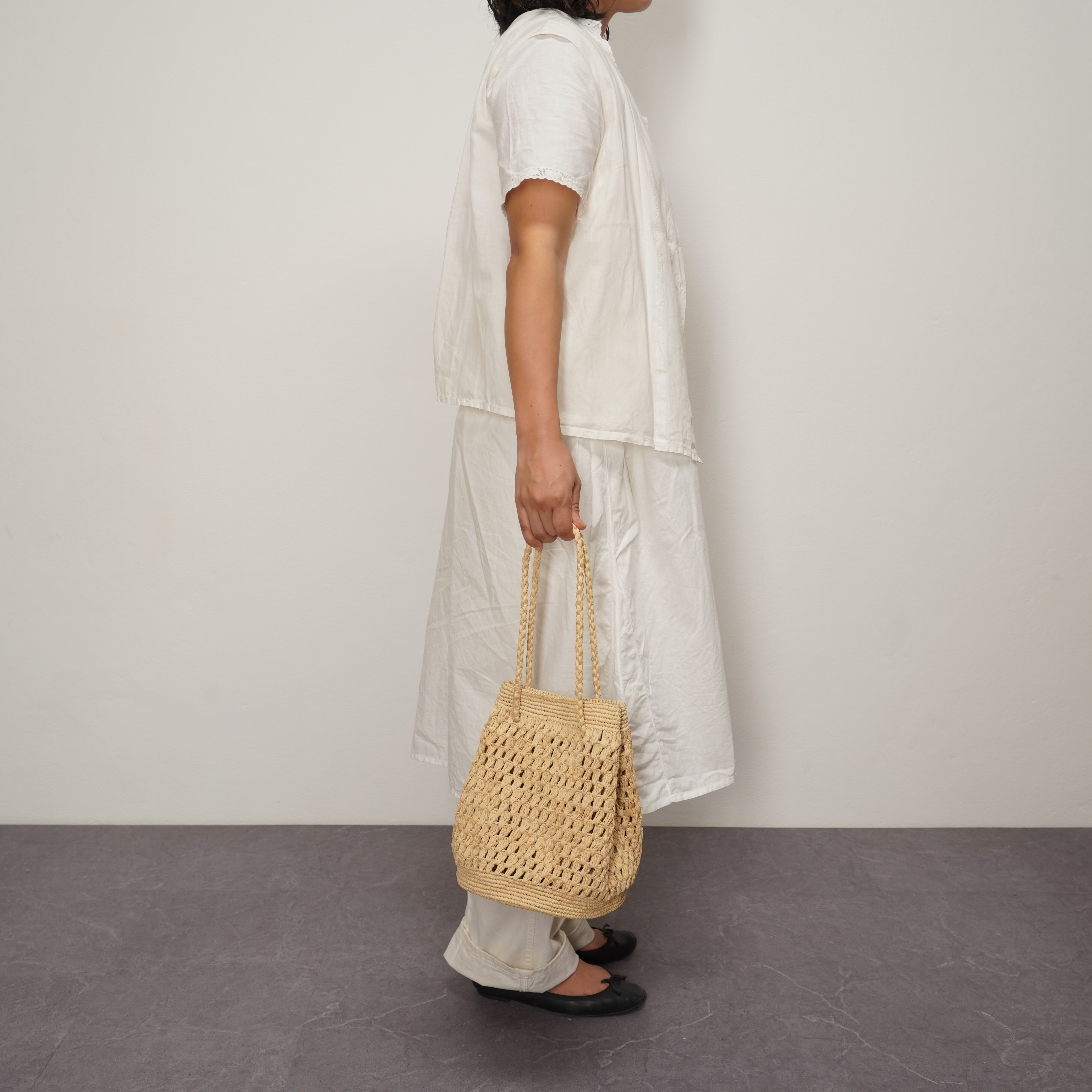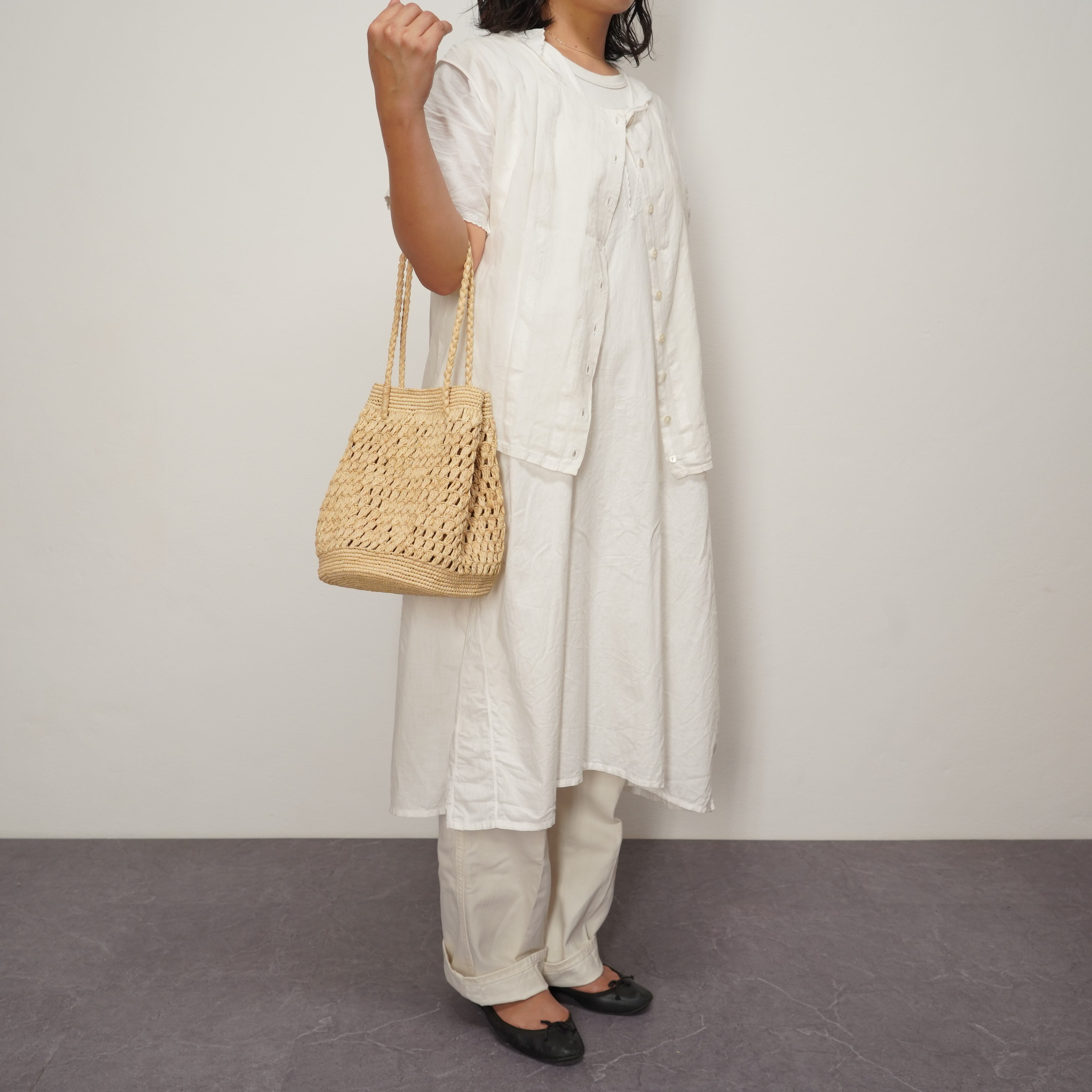 巾着をモデルに、肩掛け、ショルダー、そして手持ちでも楽しめる小ぶりなバッグを製作しました。上下はしっかりとした編み目で頑丈に仕上げ、中央は中身が透けすぎない絶妙な透かし編みに。その圧倒的な使いやすさから、早くもAMPIANAの新しい定番になりそうな予感のするモデルです。