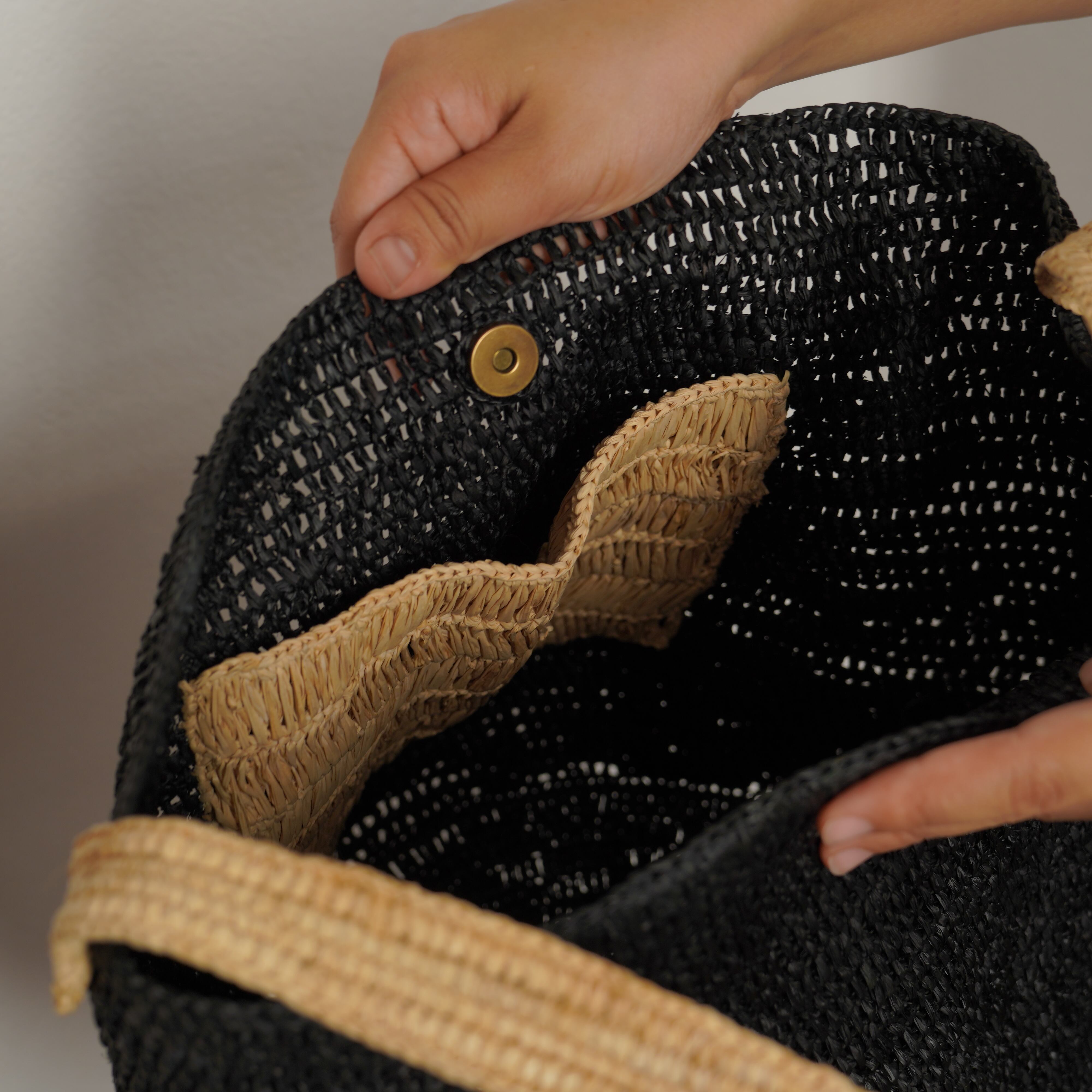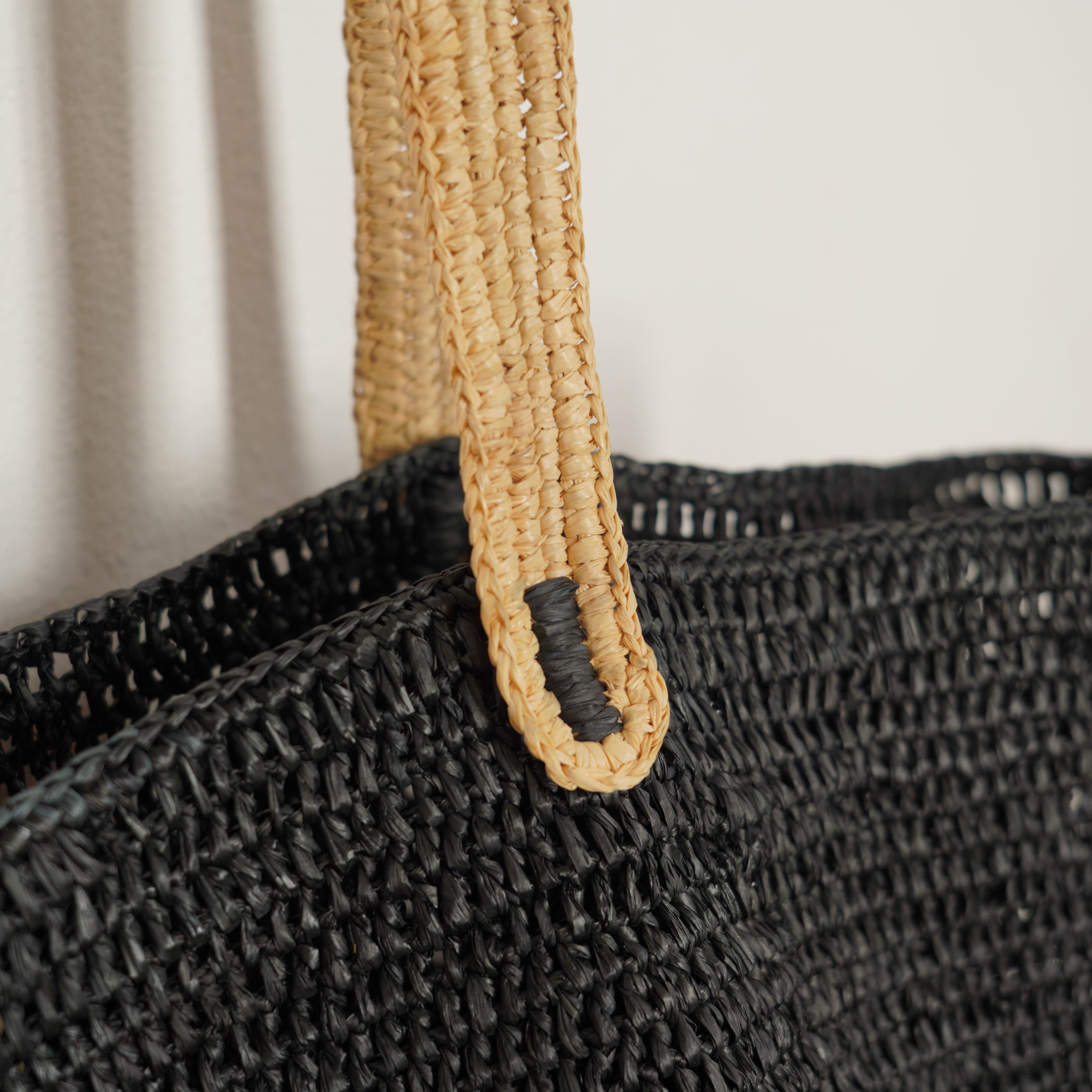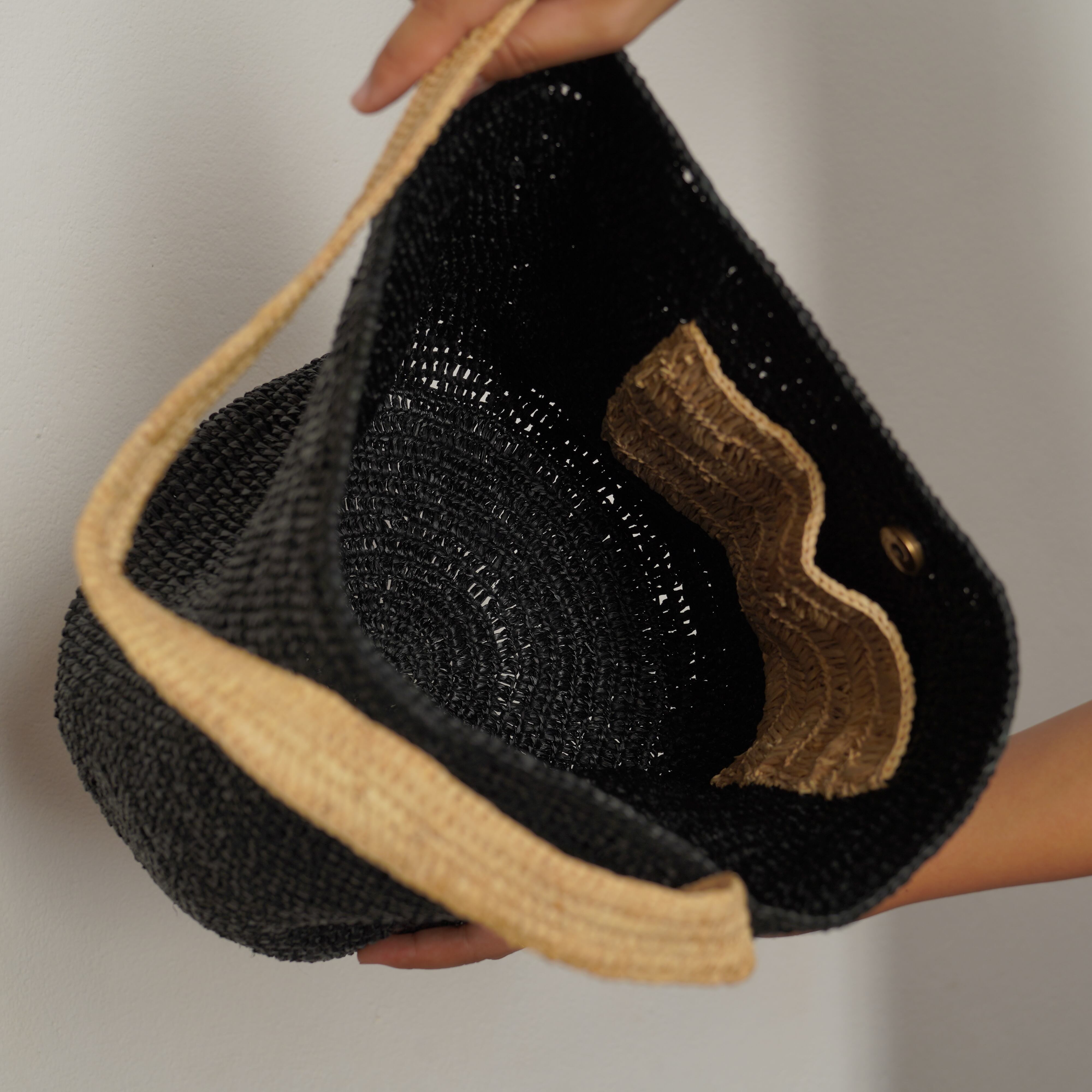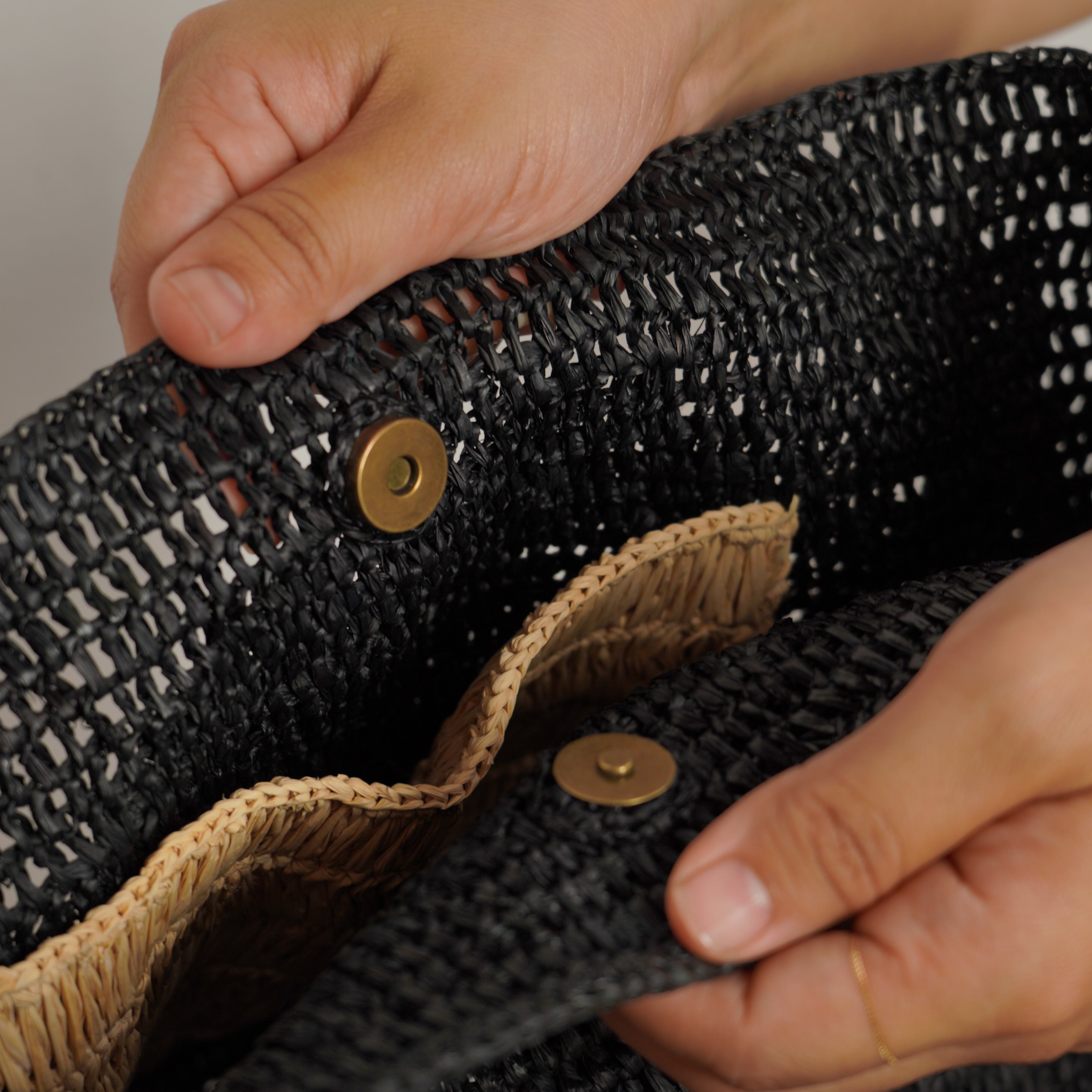 The sophisticated bi-color palette provides the perfect accent to your everyday wardrobe. This piece beautifully merges the soft texture of natural raffia with a modern form, bringing a touch of unique personality to your daily life.