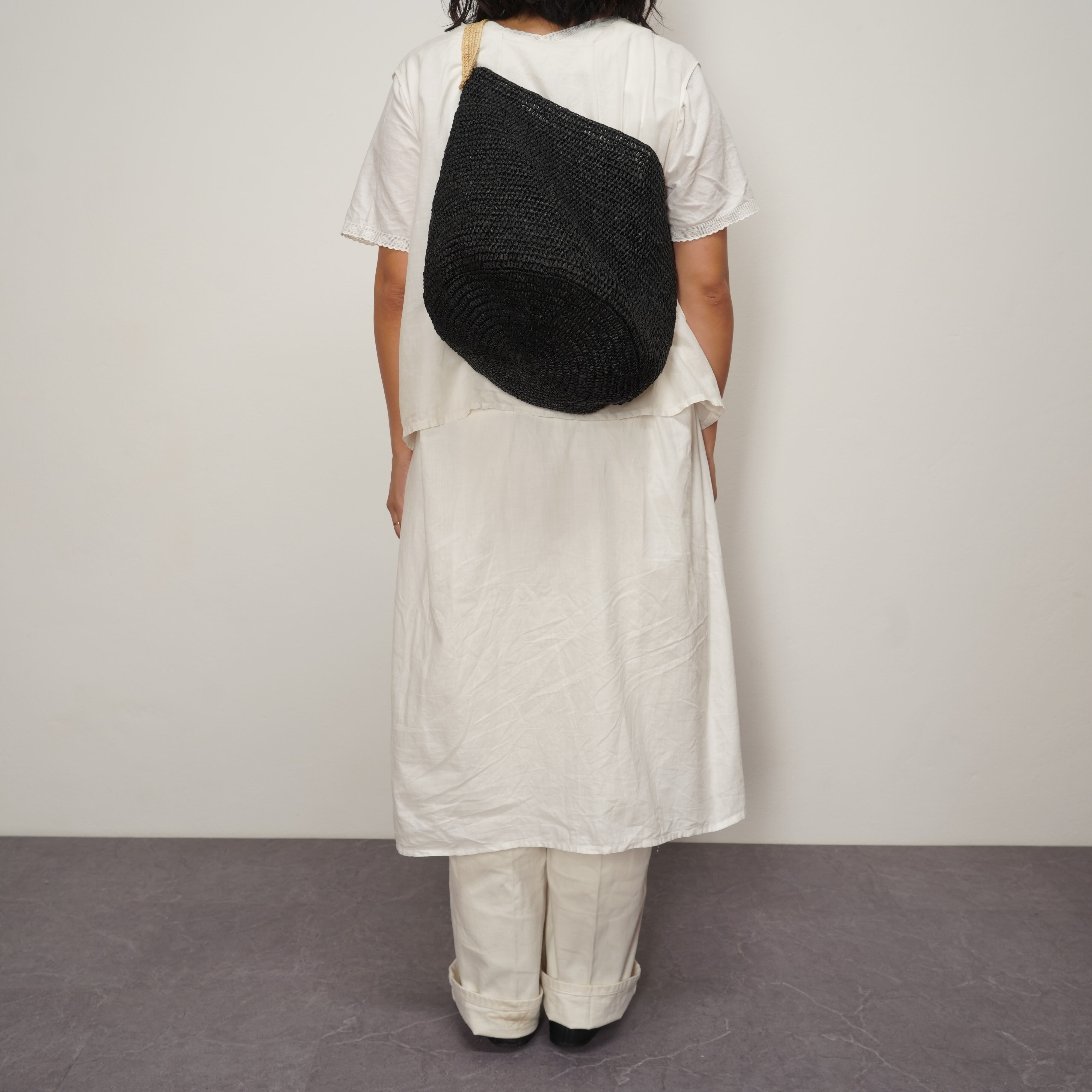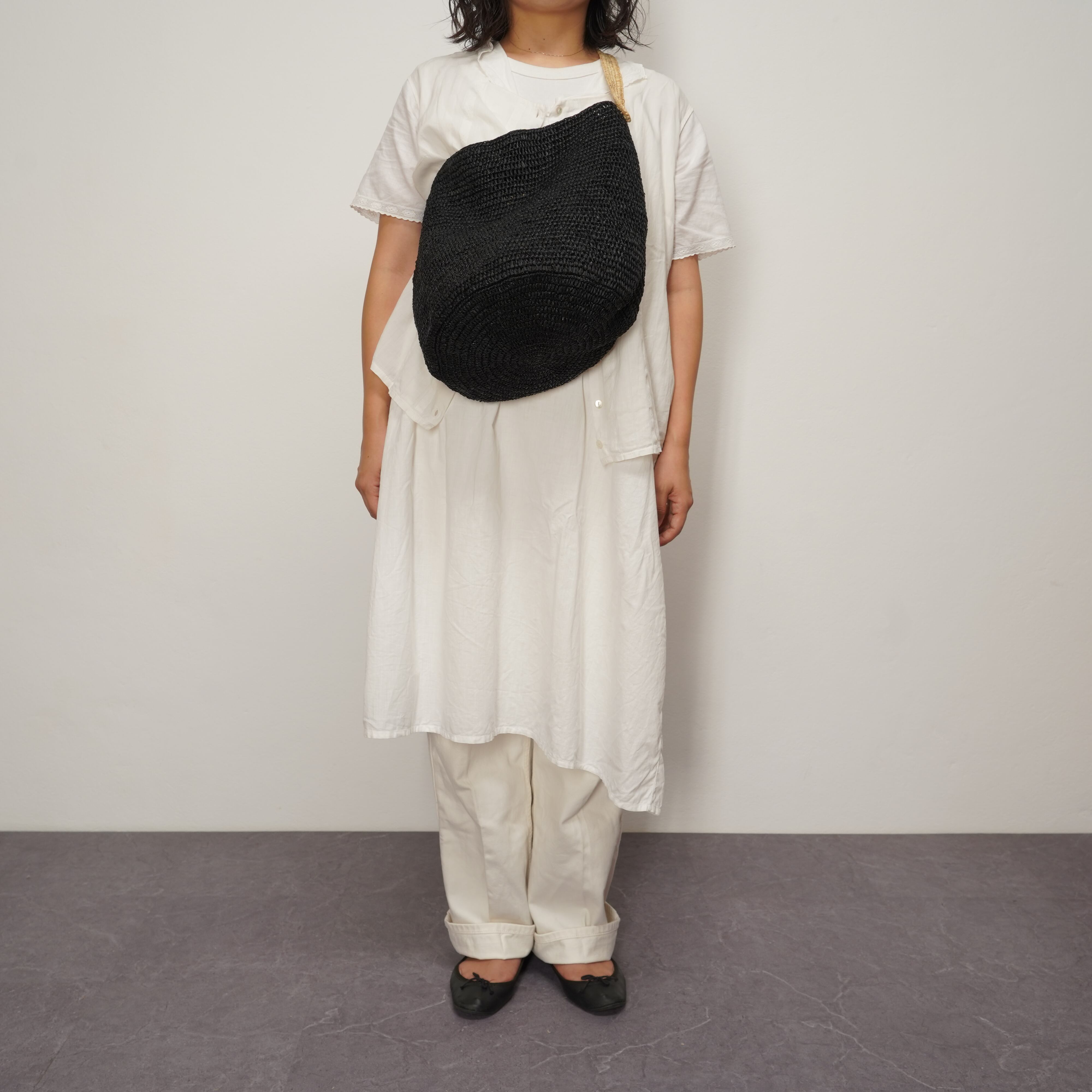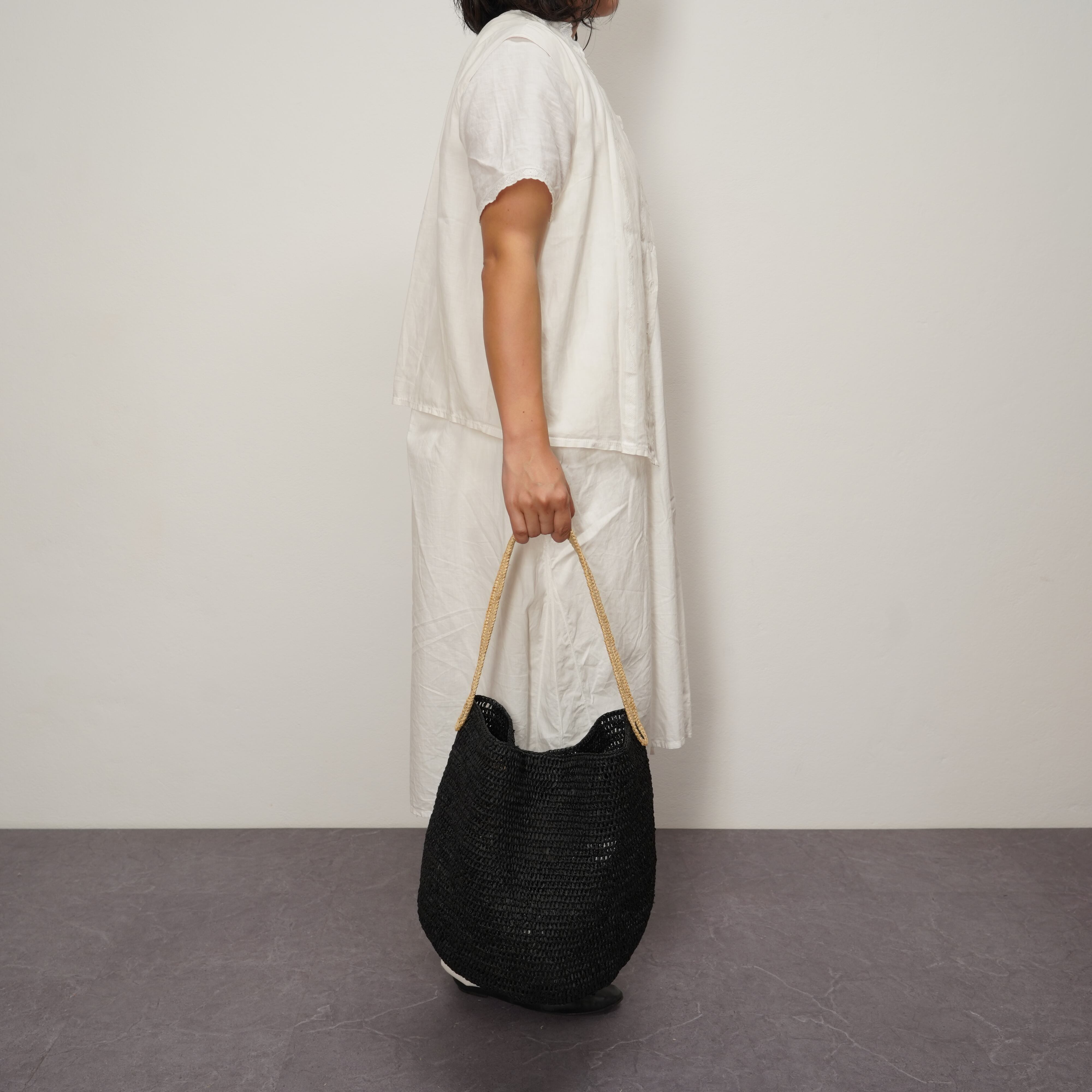 洗練されたバイカラーのデザインは、いつもの装いに程よいアクセントを添えてくれます。ラフィアの柔らかな質感とモダンなフォルムが融合した、日常に個性を彩る一点です。