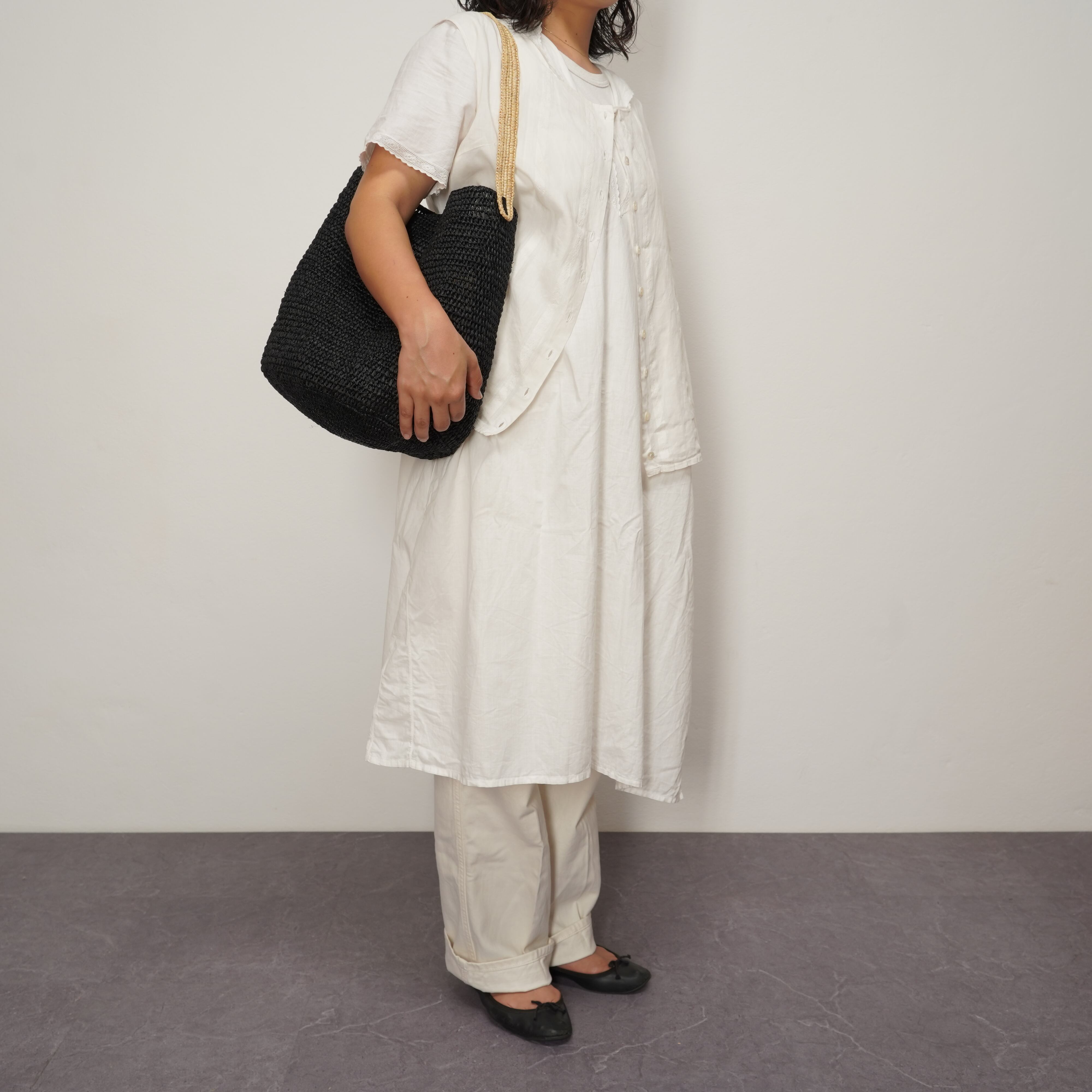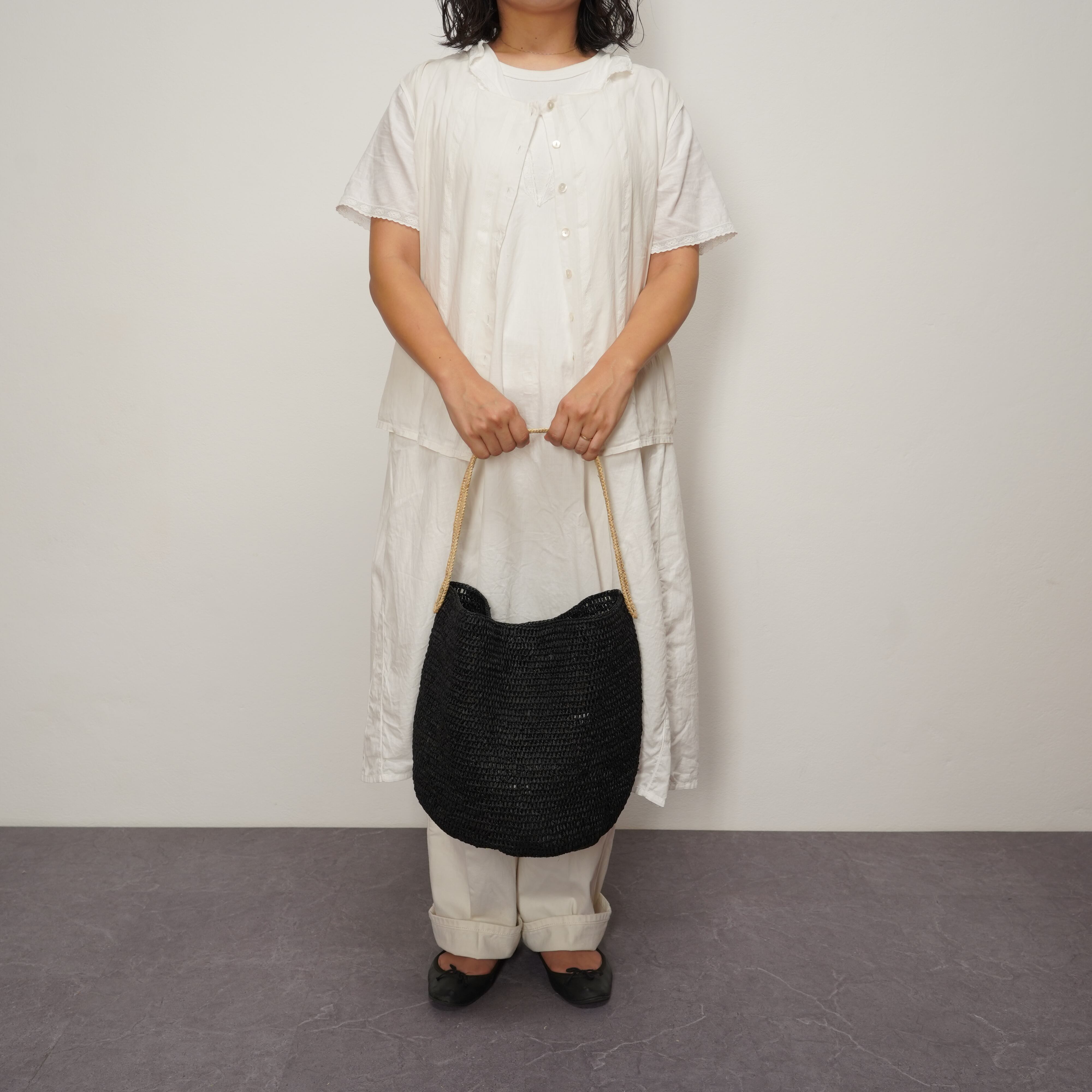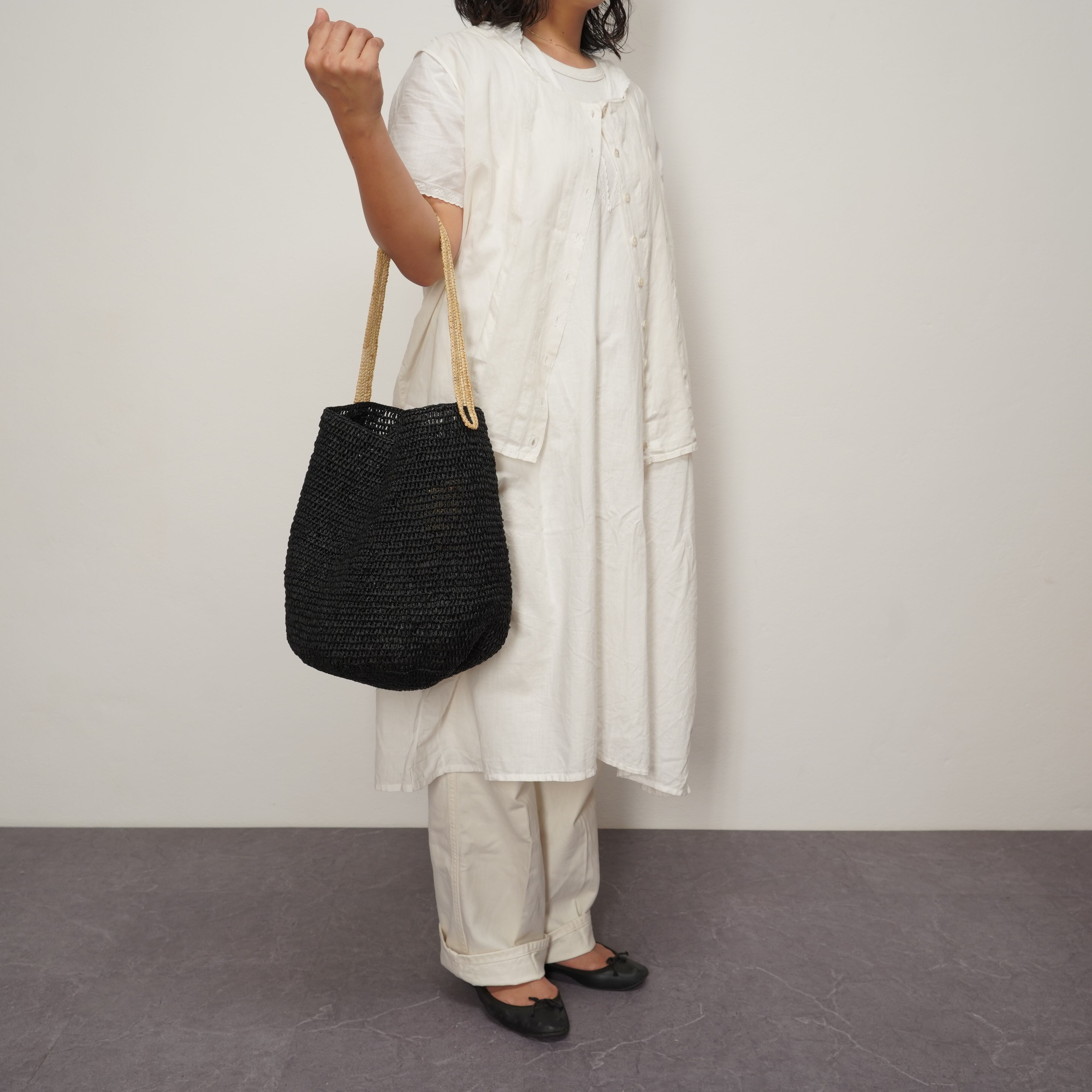 洗練されたバイカラーのデザインは、いつもの装いに程よいアクセントを添えてくれます。ラフィアの柔らかな質感とモダンなフォルムが融合した、日常に個性を彩る一点です。