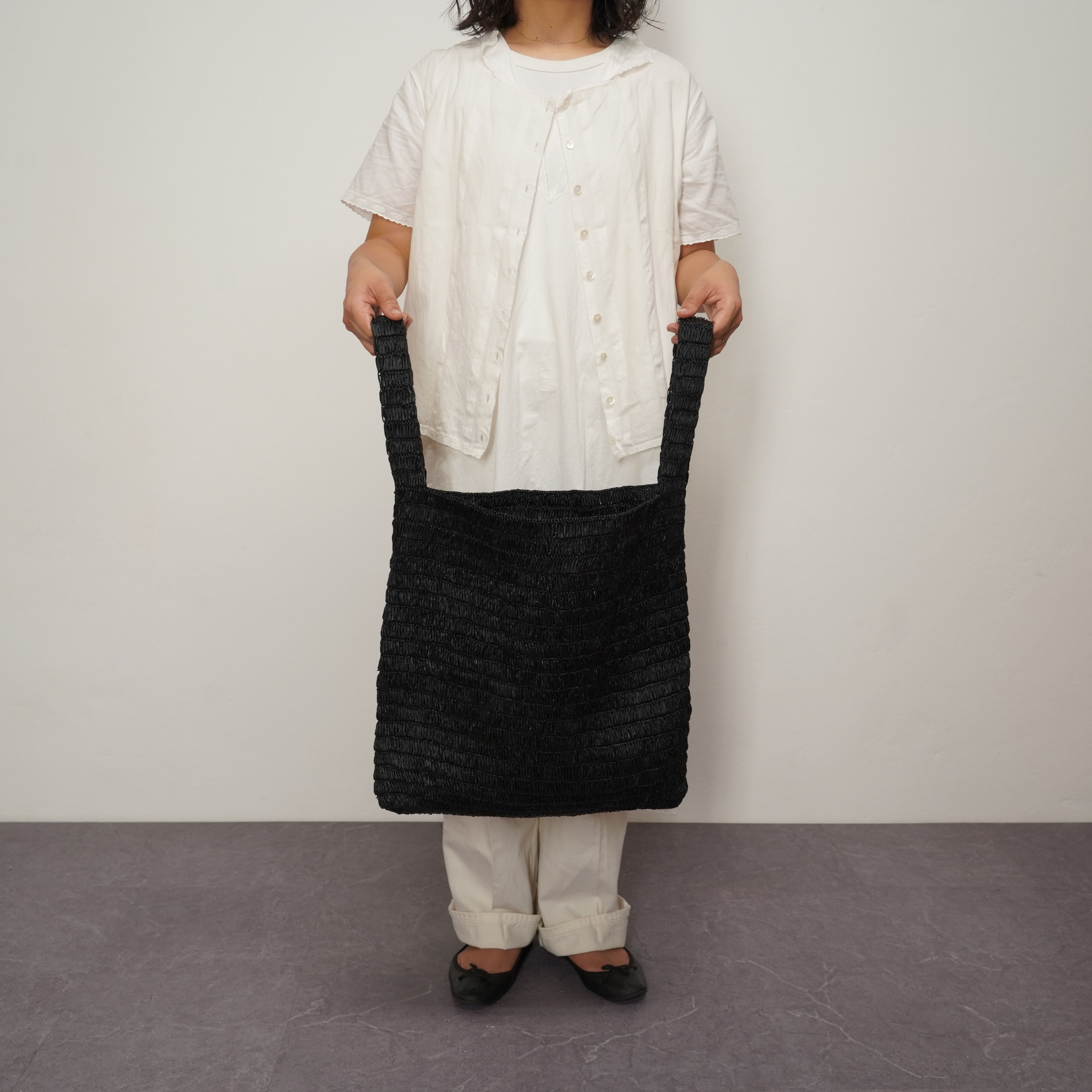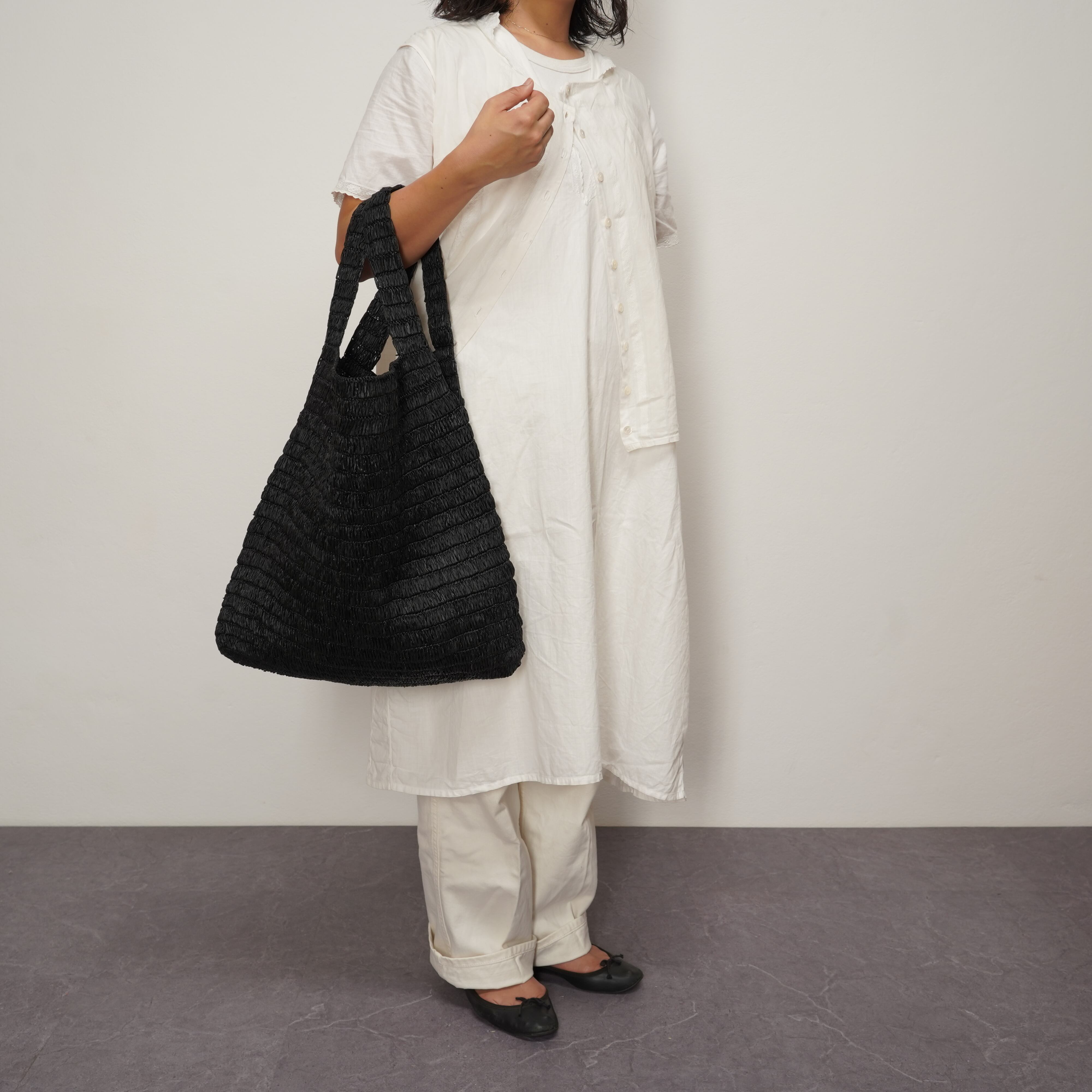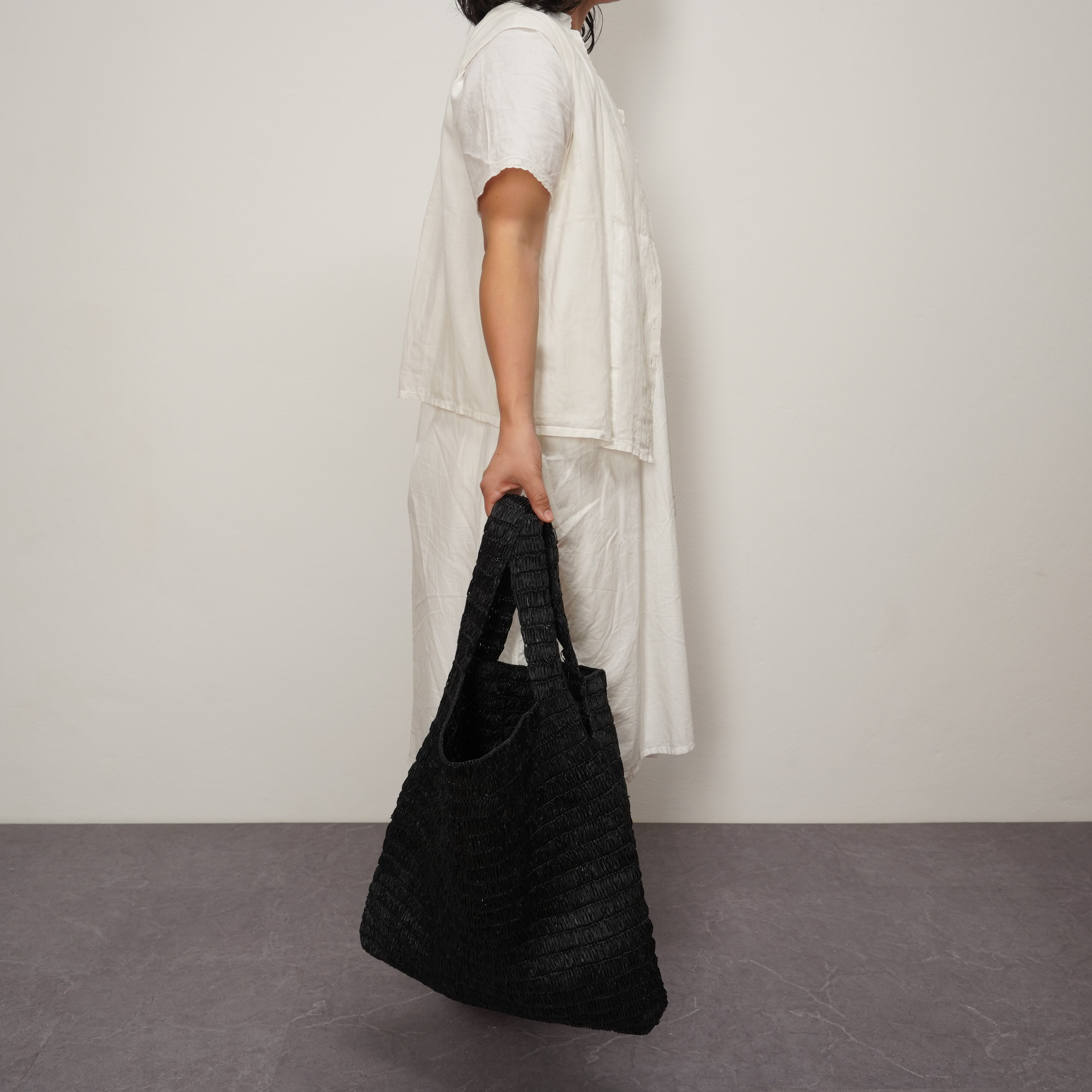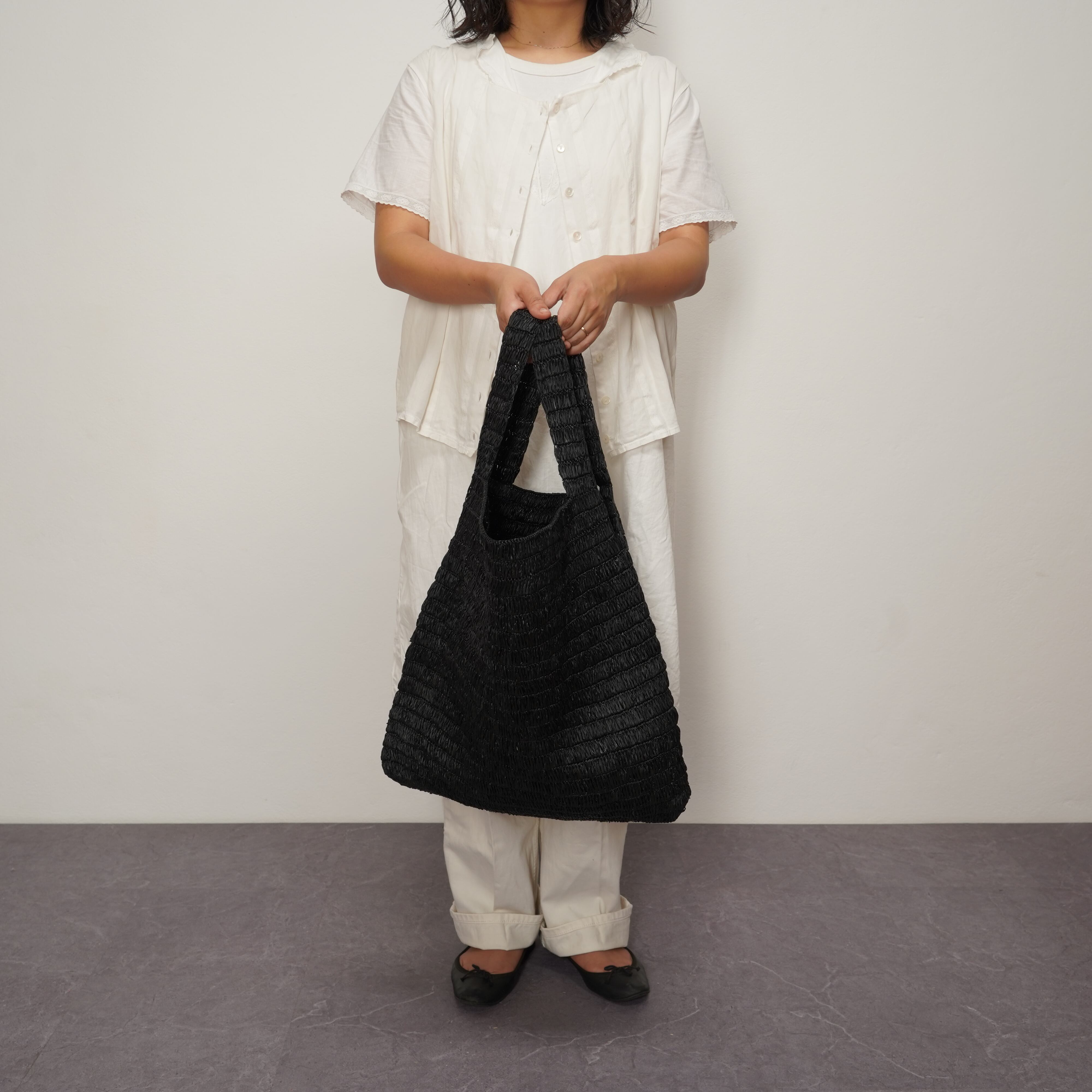 スーパーのレジ袋から着想を得た、遊び心のあるモデルです。2026年モデルは網目をより細かく密に編み上げることで、しっかりとした丈夫なアイテムに仕上がりました。持ち手の付け根にスリットを入れる工夫を施し、肩掛けした際も収まりがよく、スムーズに持ち運べます。