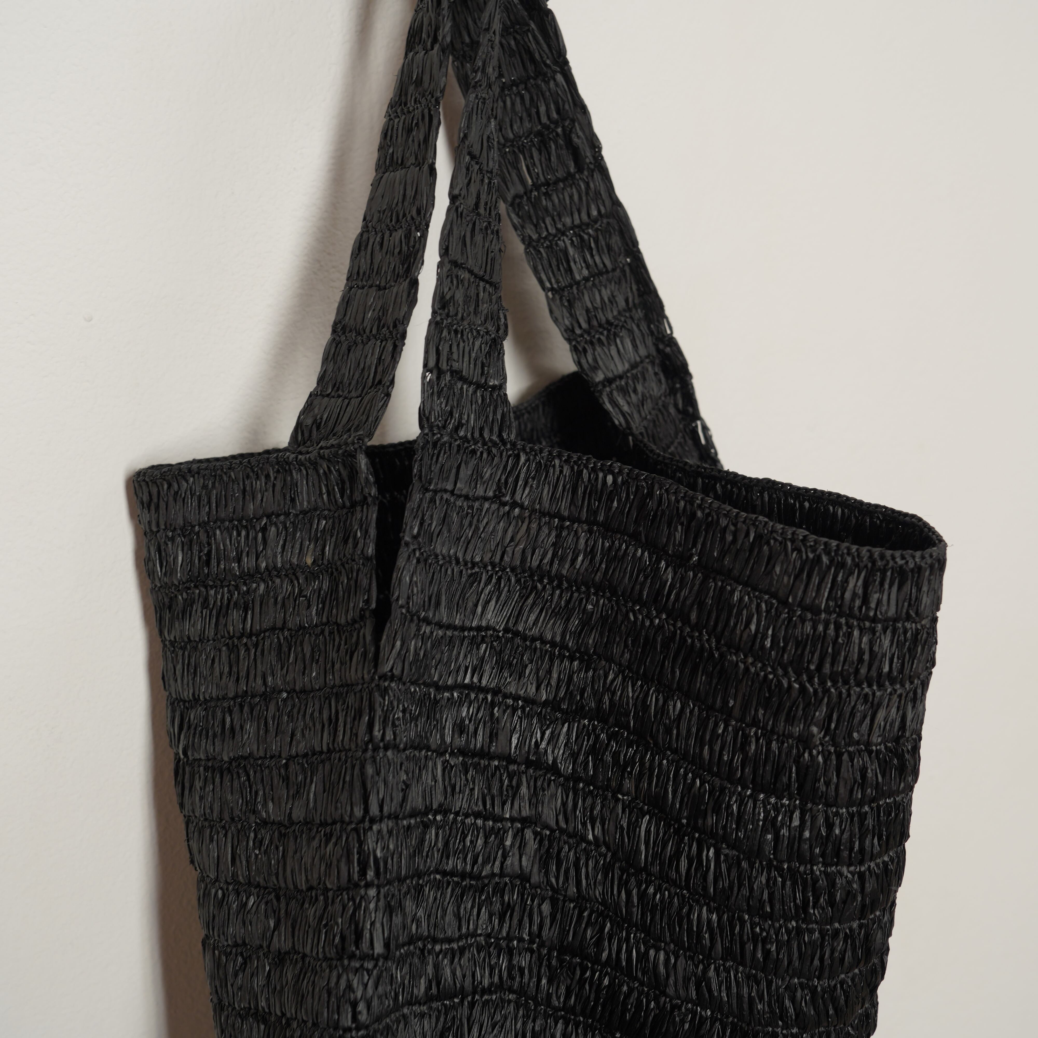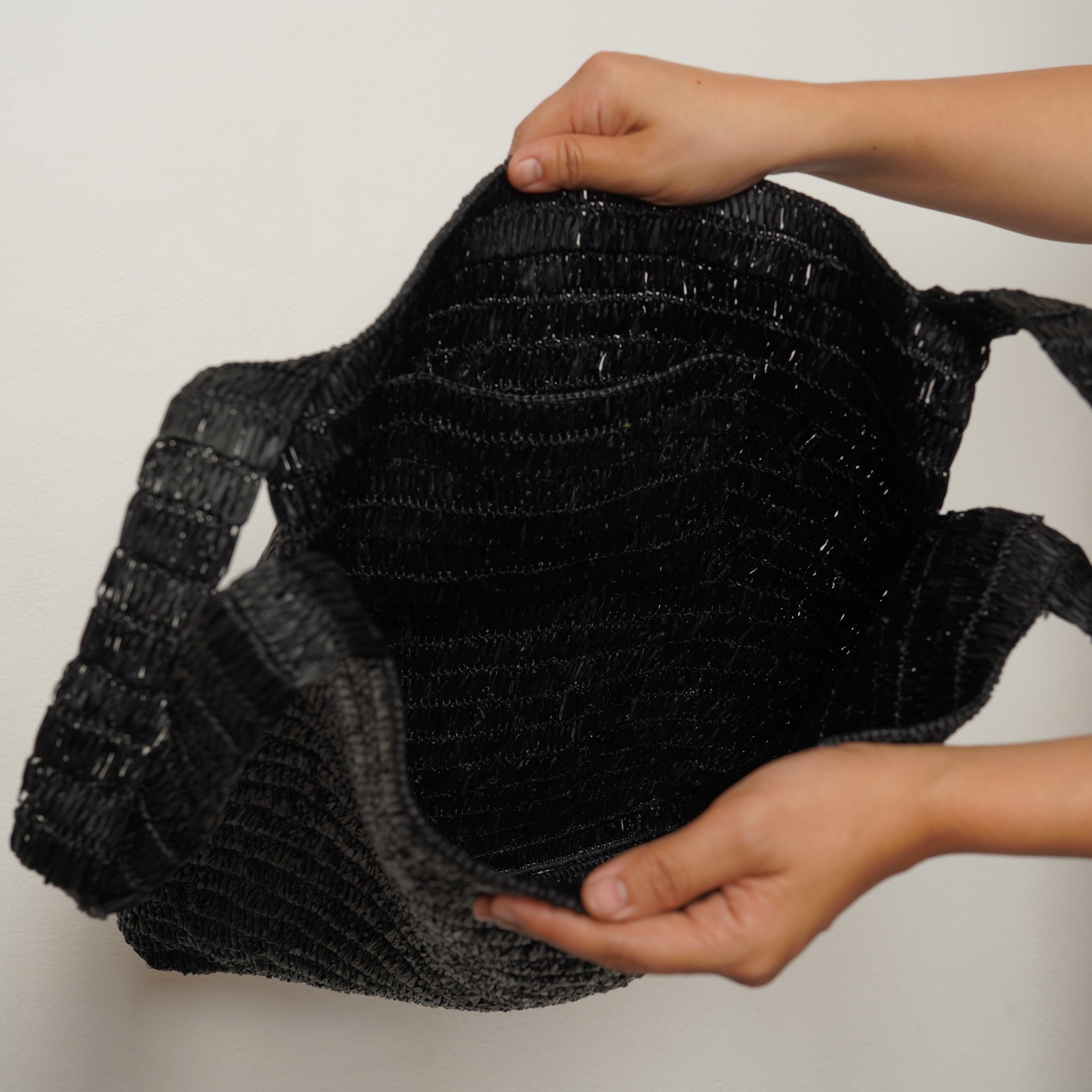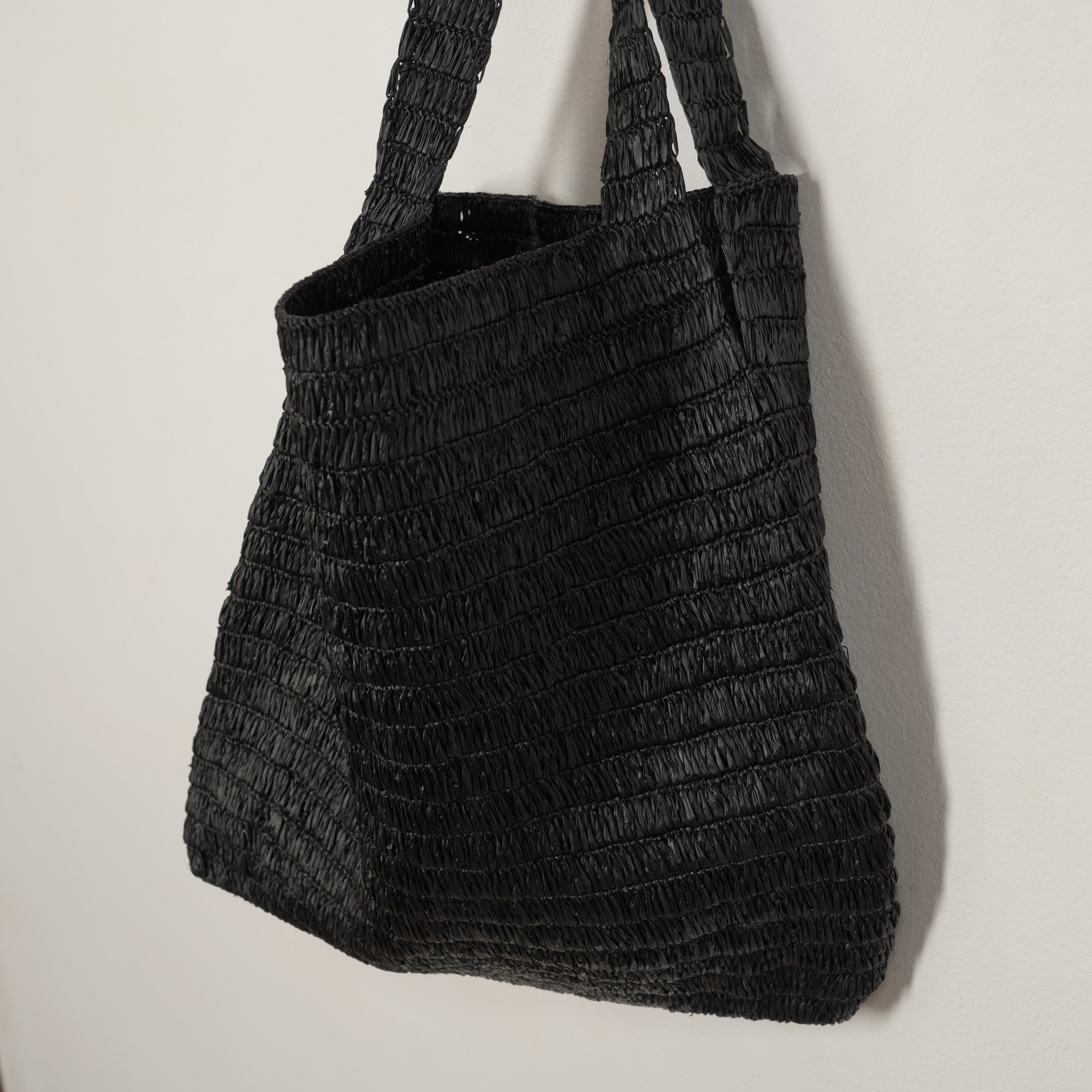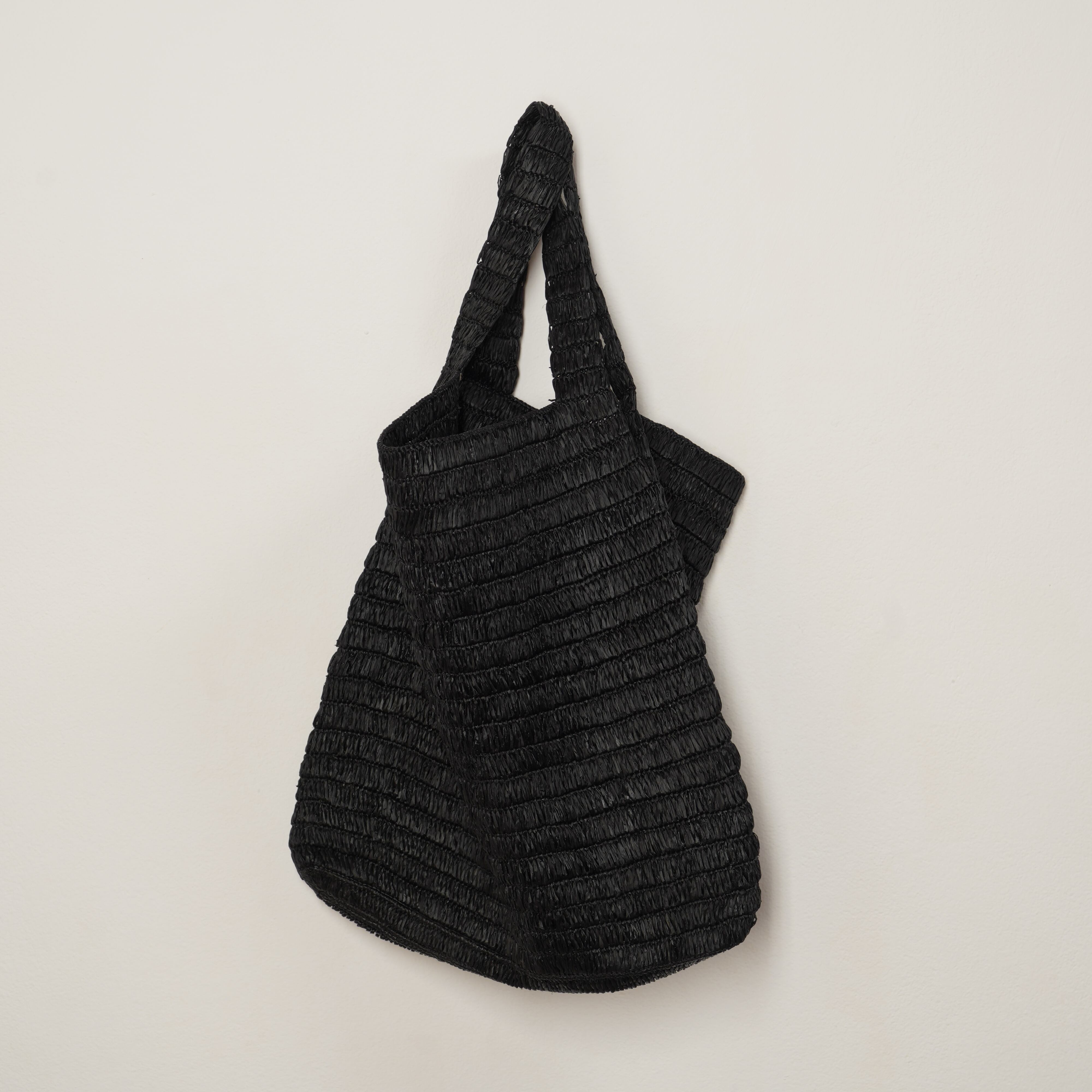 This model takes its inspiration from the simple form of a plastic shopping bag. For the 2026 edition, we have refined the weave to be finer and denser, resulting in a more structured and durable piece. By adding subtle slits at the base of the handles, we’ve made it easier to wear over the shoulder for a comfortable fit. While the raffia may feel slightly firm at first, it will soften and adapt to your movements over time, becoming easier and more pleasant to carry with every use.