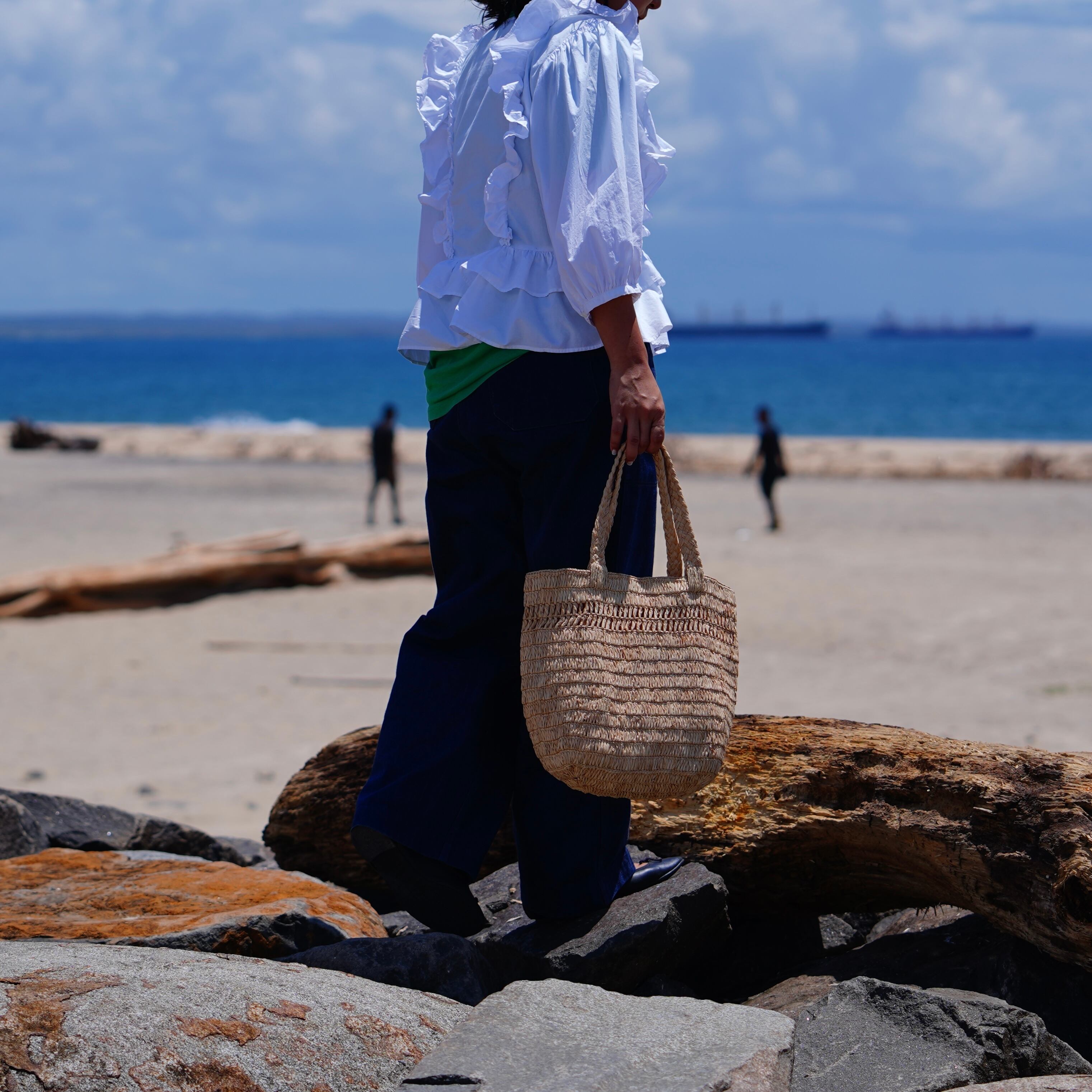お出かけに必要なものがすっきりと収まる、デイリーユースに最適なサイズ感。ラフィアならではの軽やかさで、どんなシーンでも軽快に持ち歩けます。