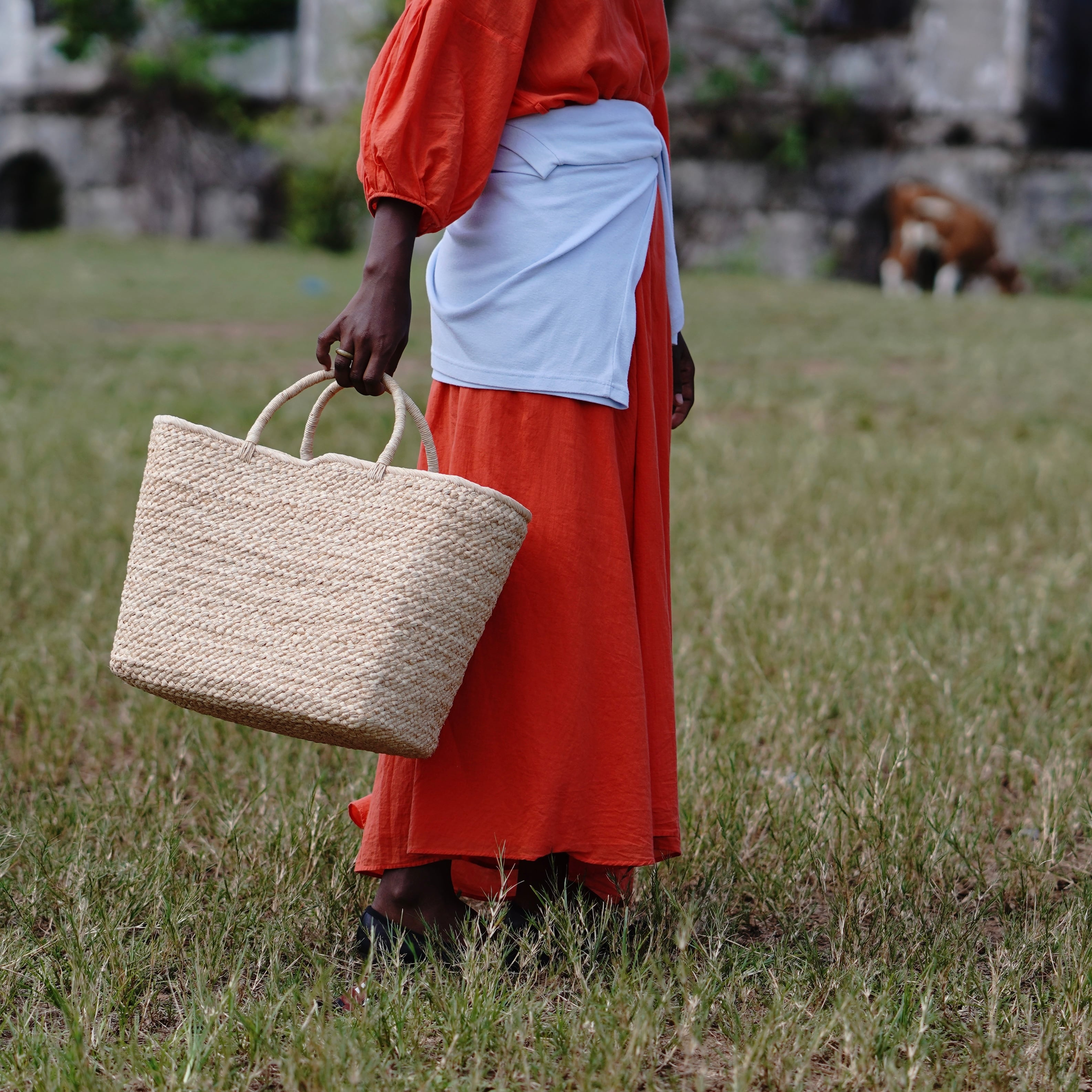 "From weekend trips to daily errands." With a generous 20L capacity, this size is perfect for a one-night trip. Despite its size, the raffia material makes it remarkably lightweight, making it an ideal companion for grocery shopping, picnics, or as a mother’s bag.