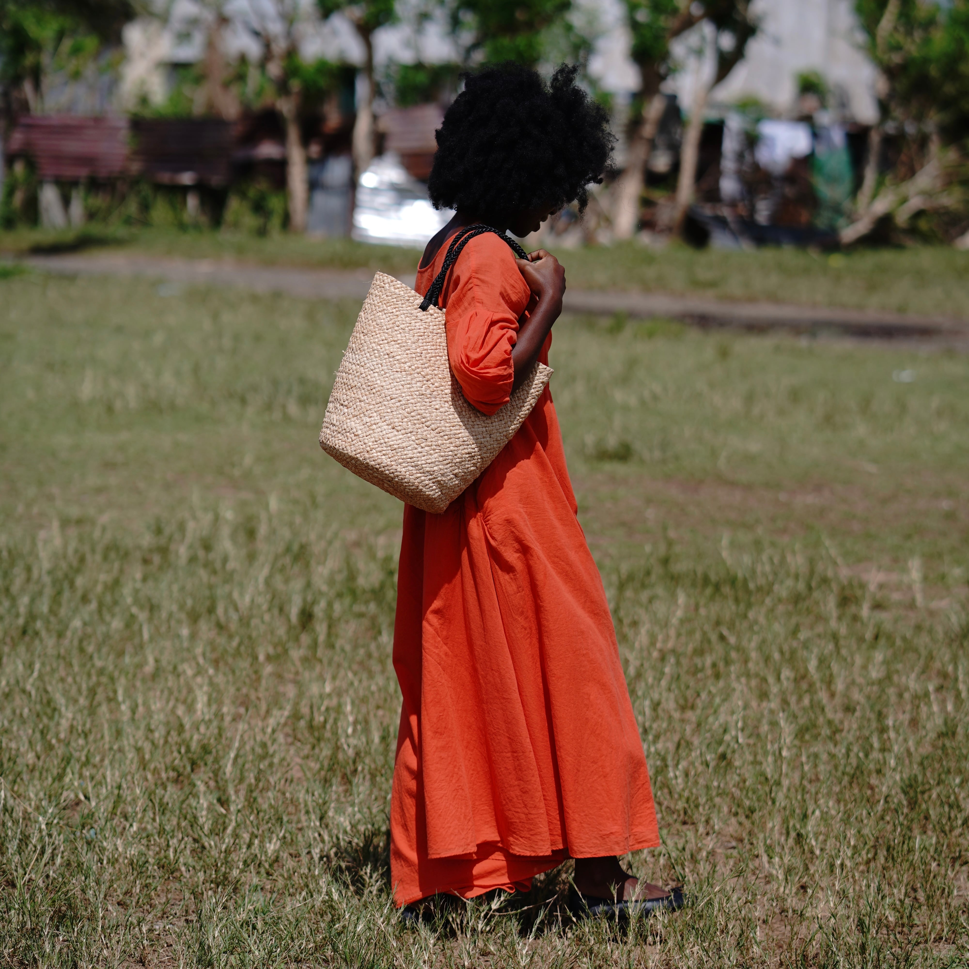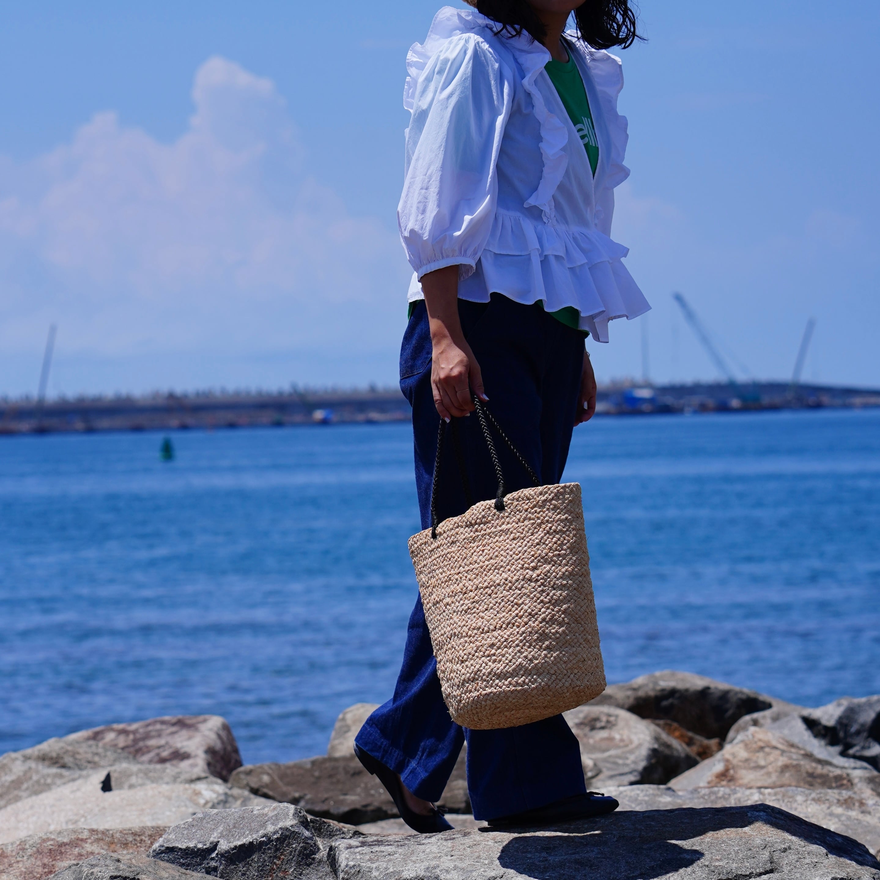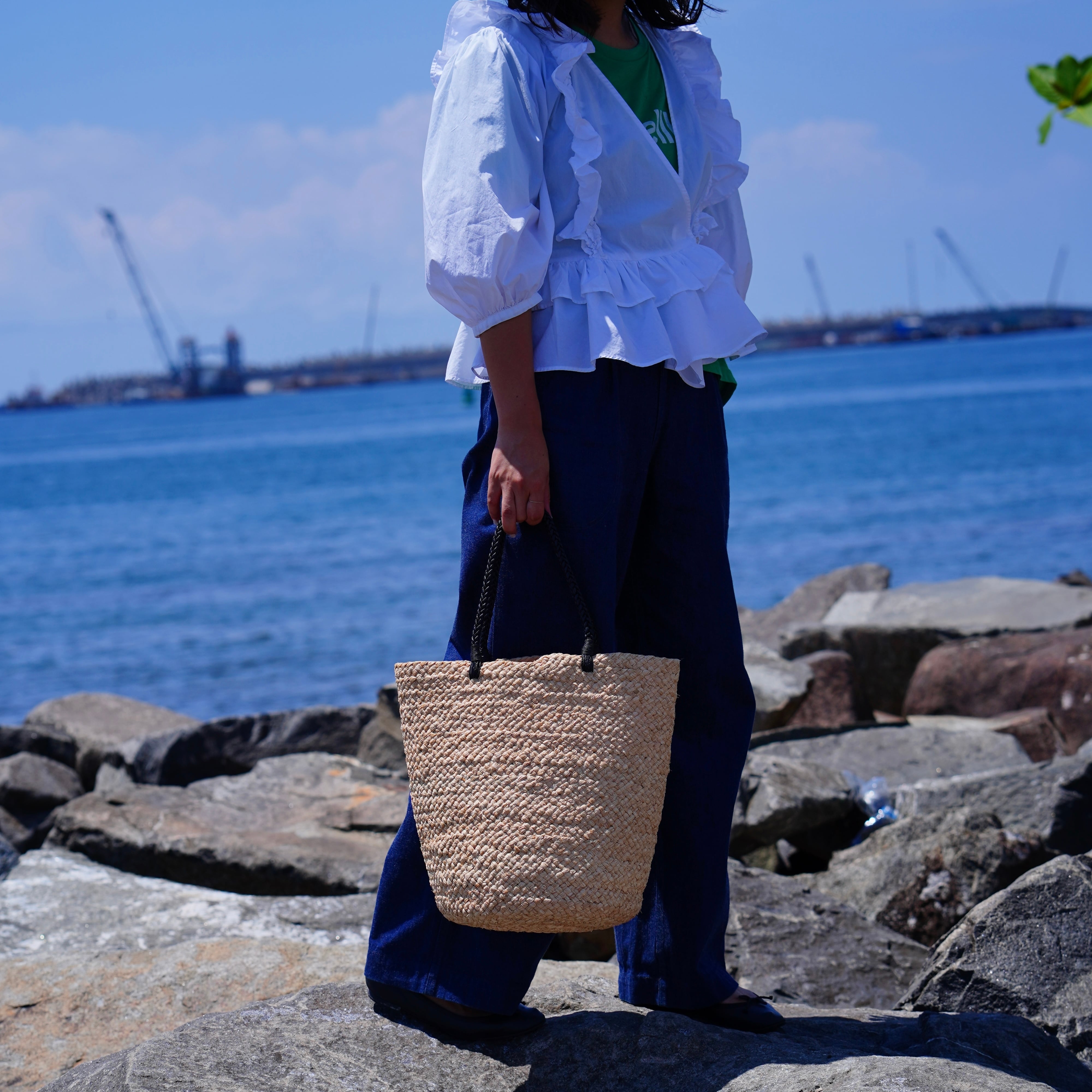 This model was born from the functional beauty of fishing bags discovered in Madagascar. While using the same weaving technique as our signature "Marche Bag," this is our first model to feature long handles designed for shoulder carrying. The sharp black handles add a touch of refined contrast to the natural raffia, lending the bag a sophisticated, urban edge.