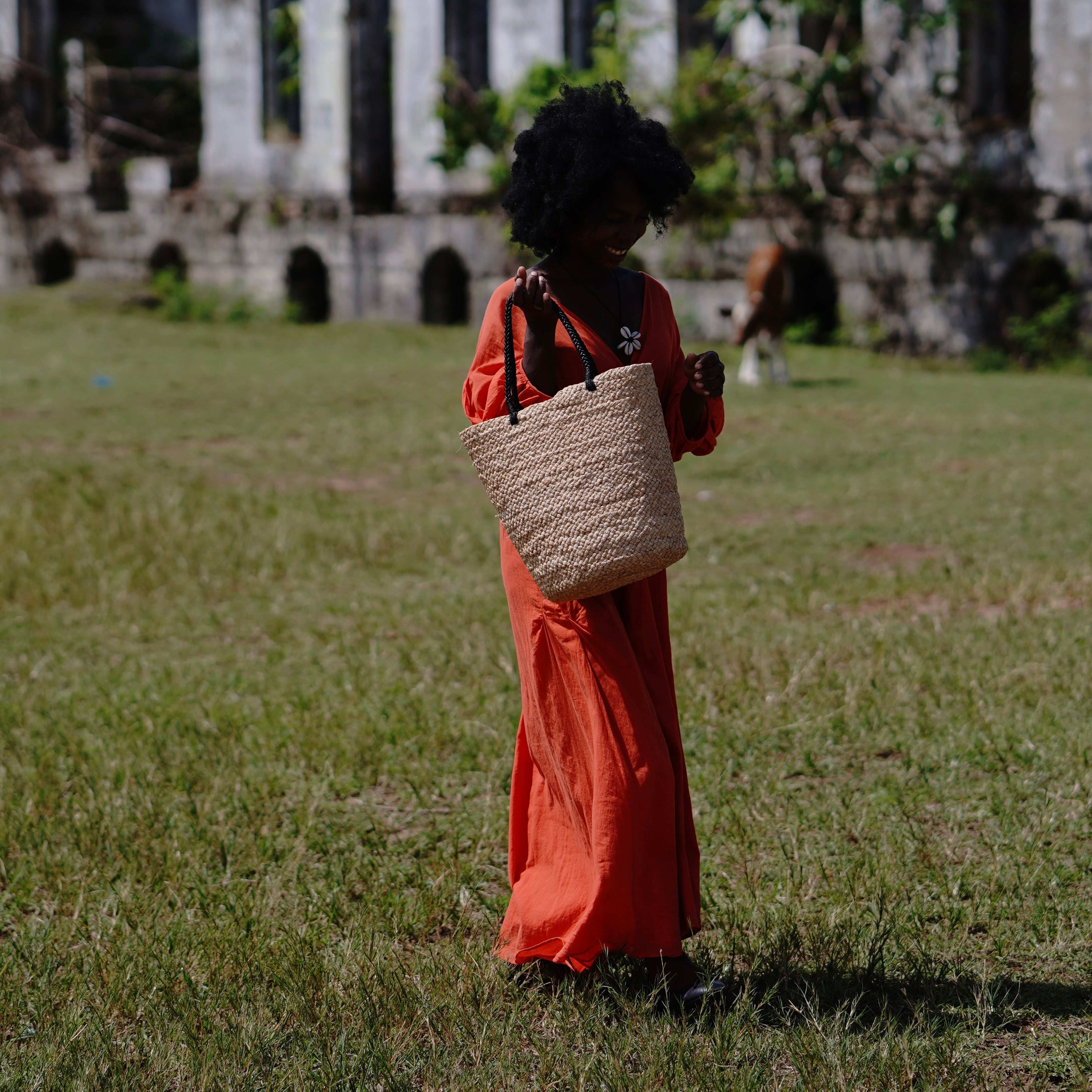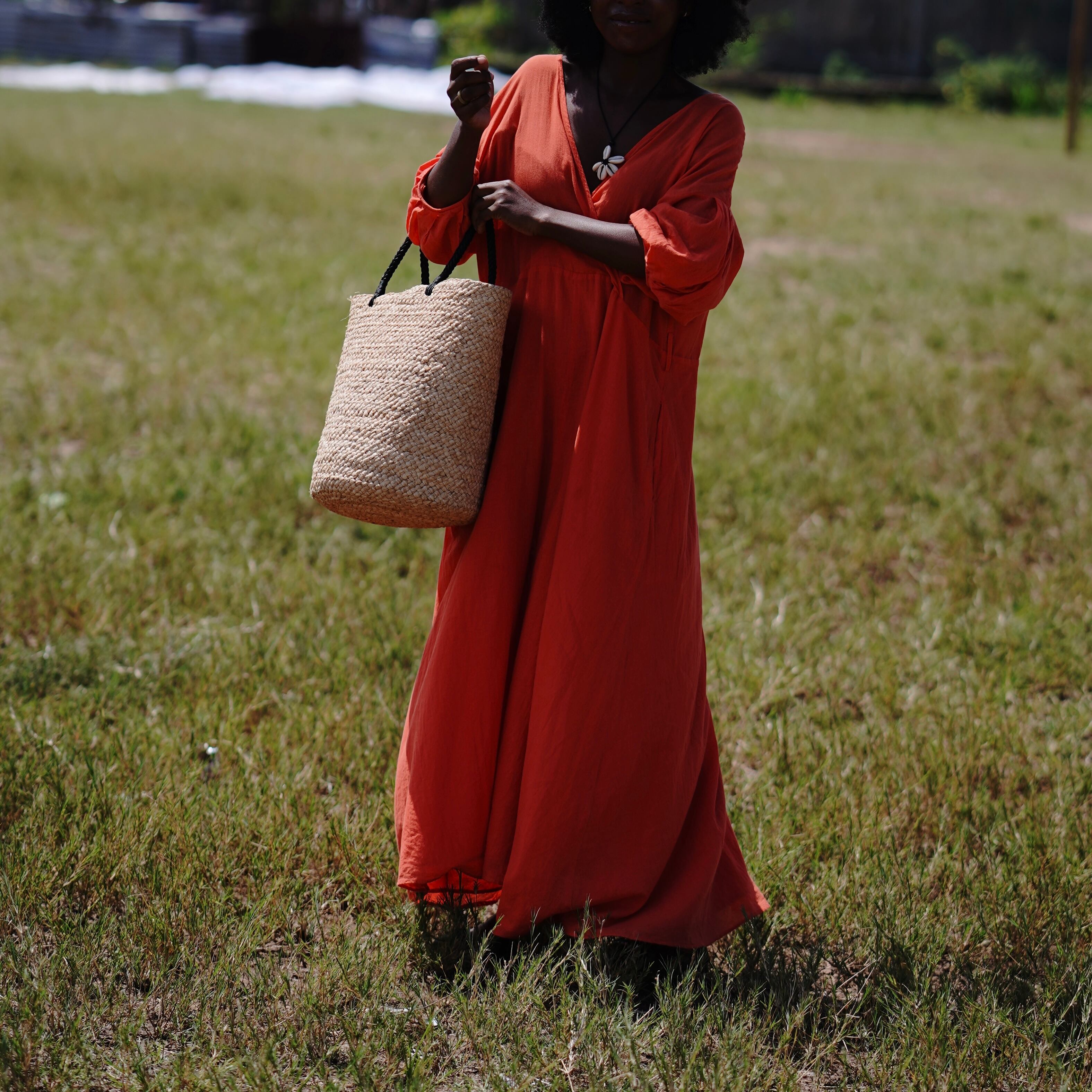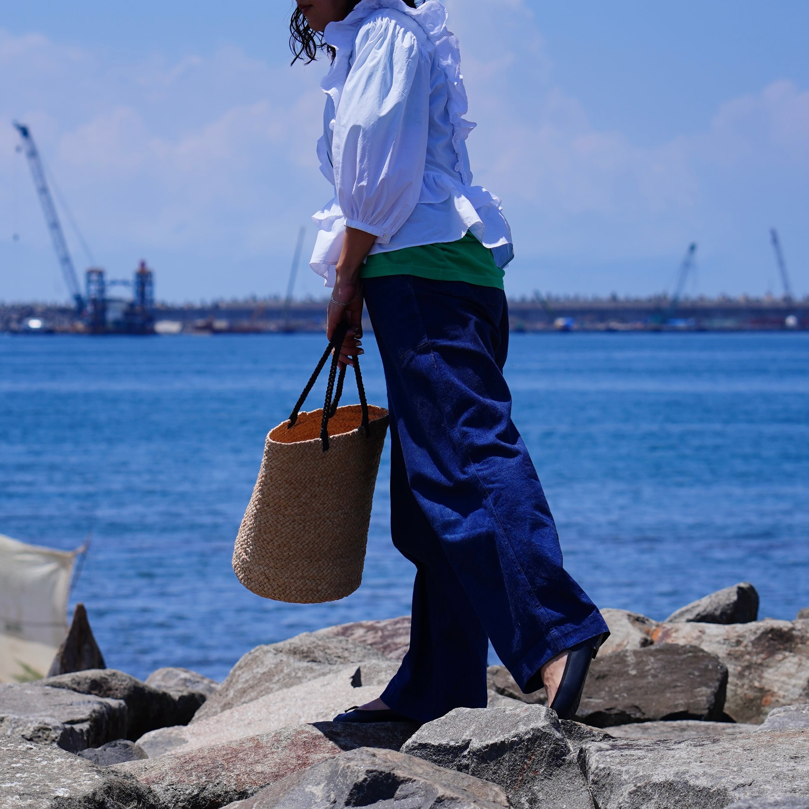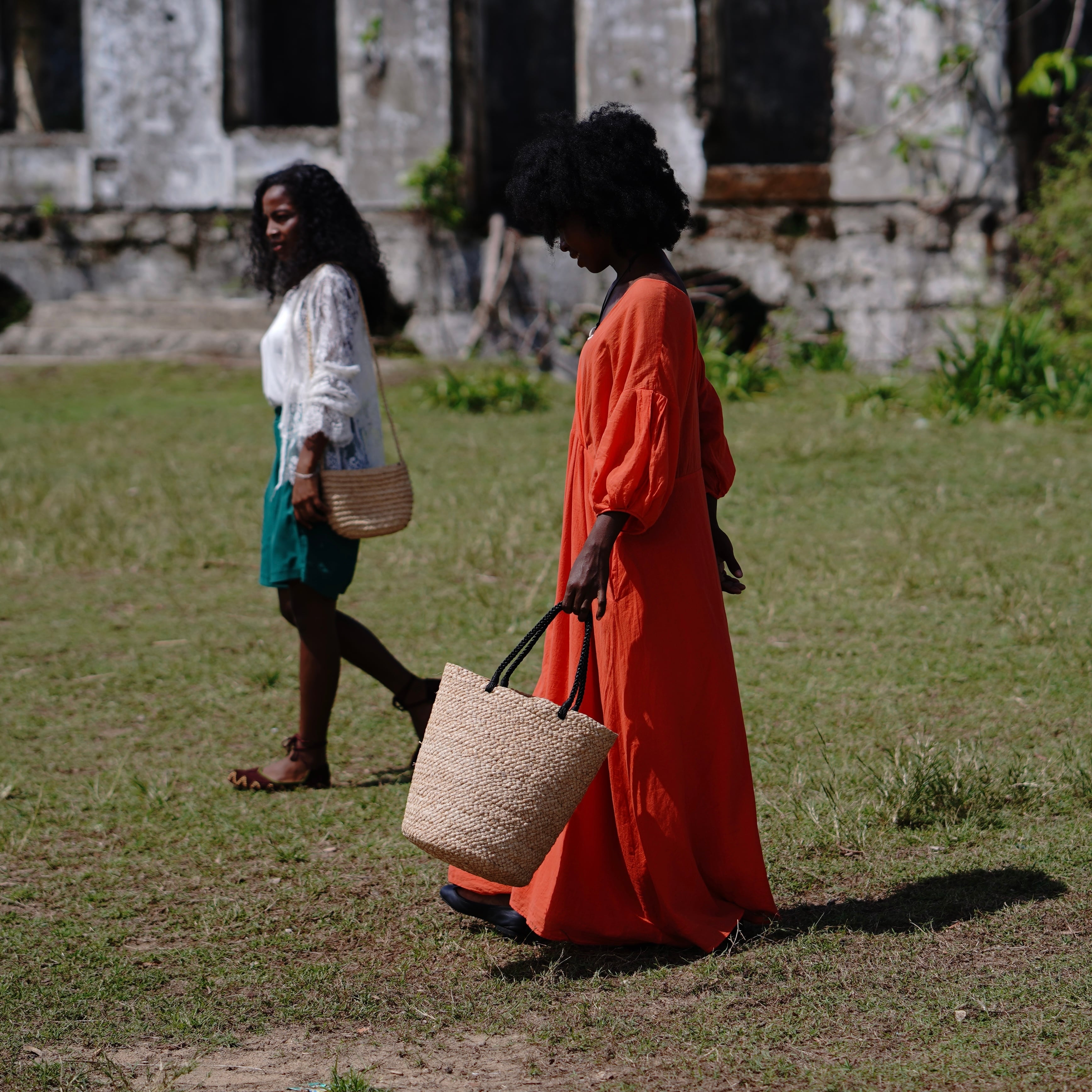 This model was born from the functional beauty of fishing bags discovered in Madagascar. While using the same weaving technique as our signature "Marche Bag," this is our first model to feature long handles designed for shoulder carrying. The sharp black handles add a touch of refined contrast to the natural raffia, lending the bag a sophisticated, urban edge.