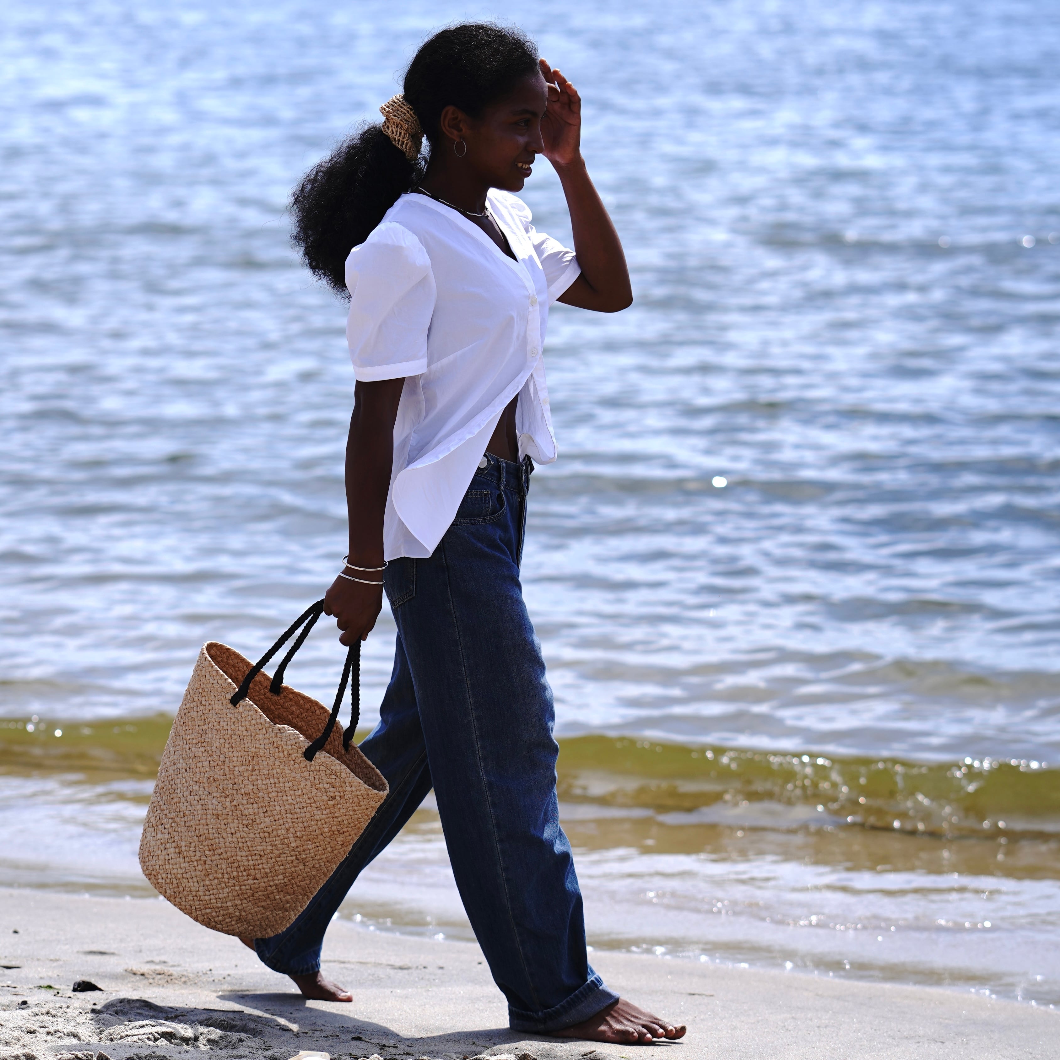 私たちのシグネチャーである「マルシェバッグ」と同じ編み方を採用しながら、肩にかけられる長めのハンドルを初めて組み合わせました。きりっとしたブラックの持ち手が、ナチュラルなラフィアの表情に程よい緊張感を与え、都会的な印象を添えてくれます。