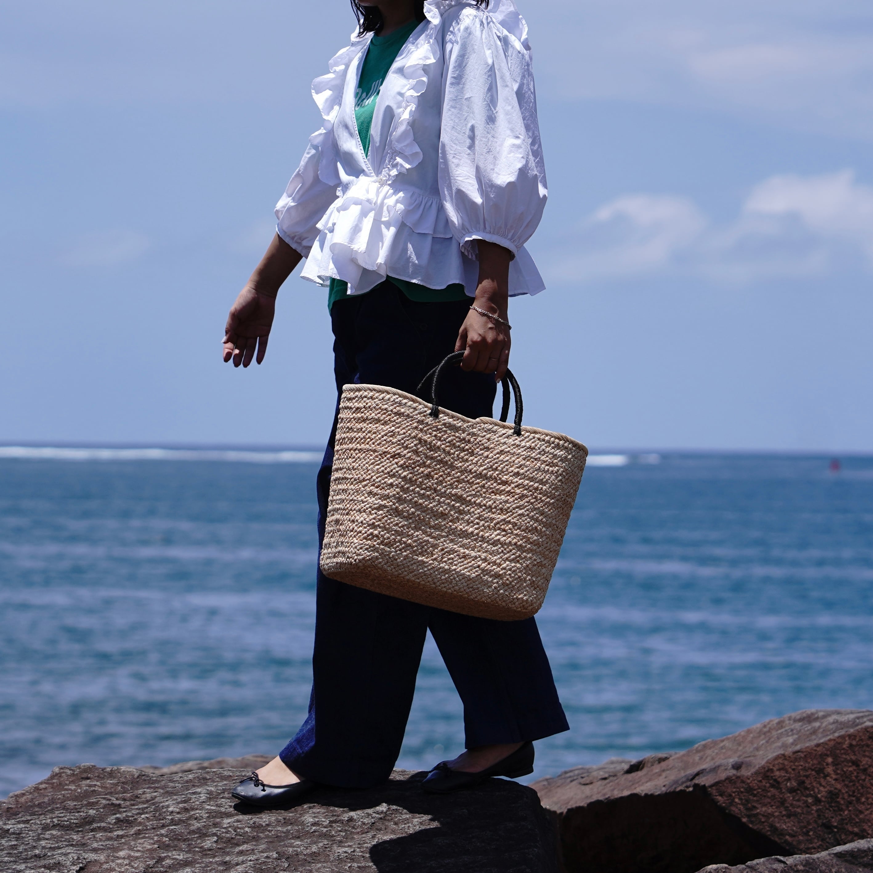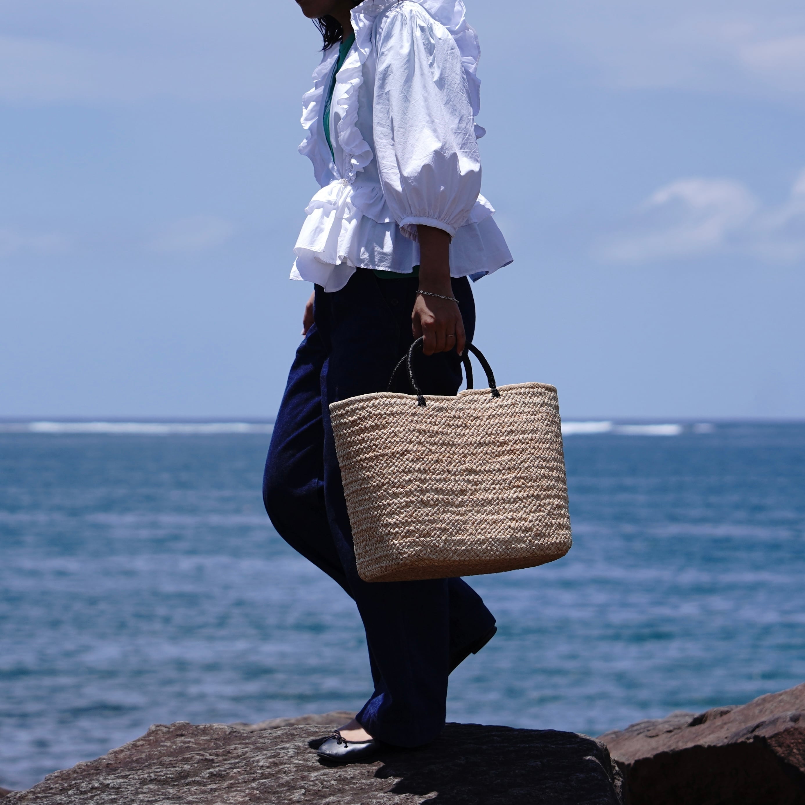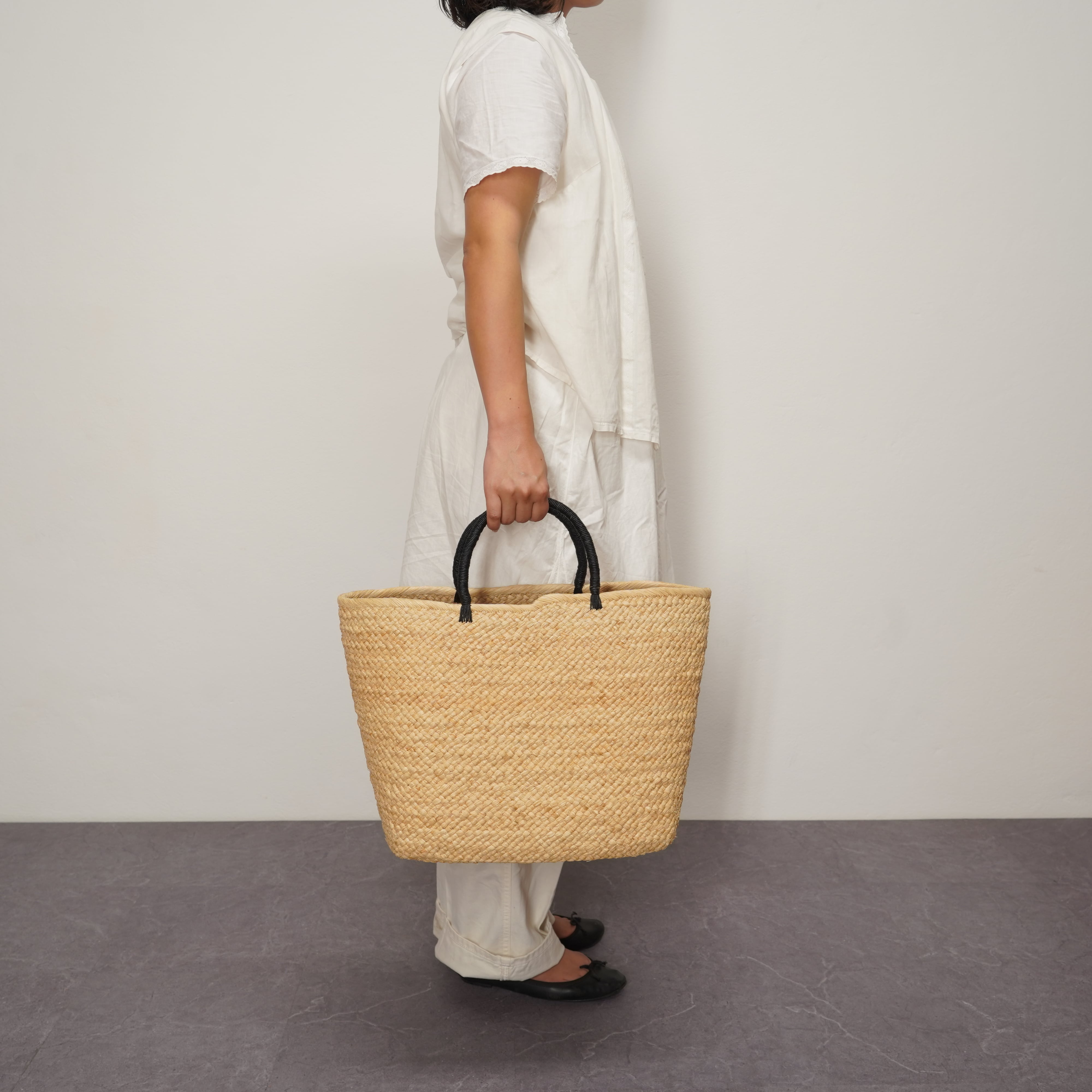 "From weekend trips to daily errands." With a generous 20L capacity, this size is perfect for a one-night trip. Despite its size, the raffia material makes it remarkably lightweight, making it an ideal companion for grocery shopping, picnics, or as a mother’s bag.