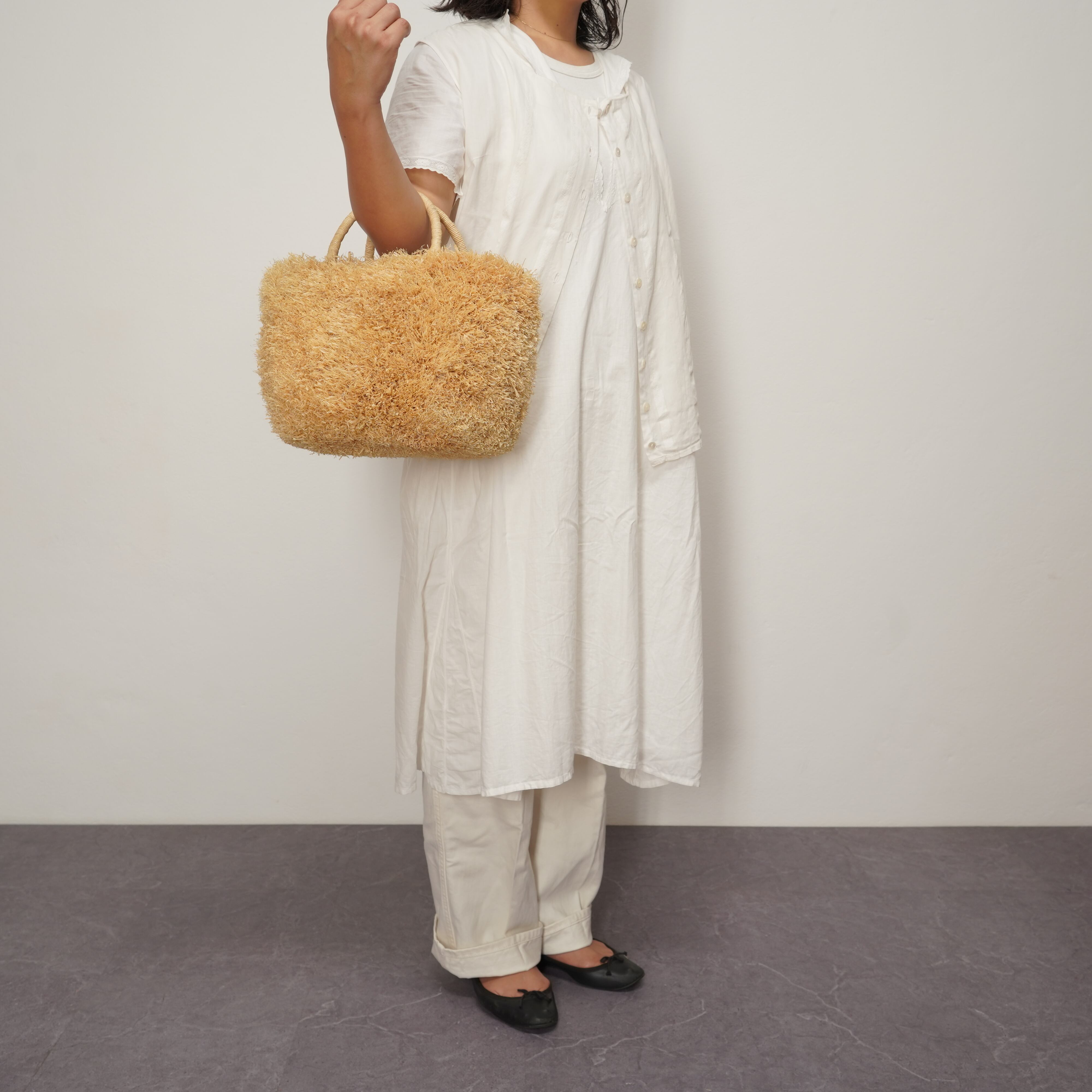 天然のラフィアは、使い込むほどにしなやかになり、持ち主の身体に馴染んでいきます。年月とともに少しずつ変わっていく、自然な風合いをお楽しみください。
